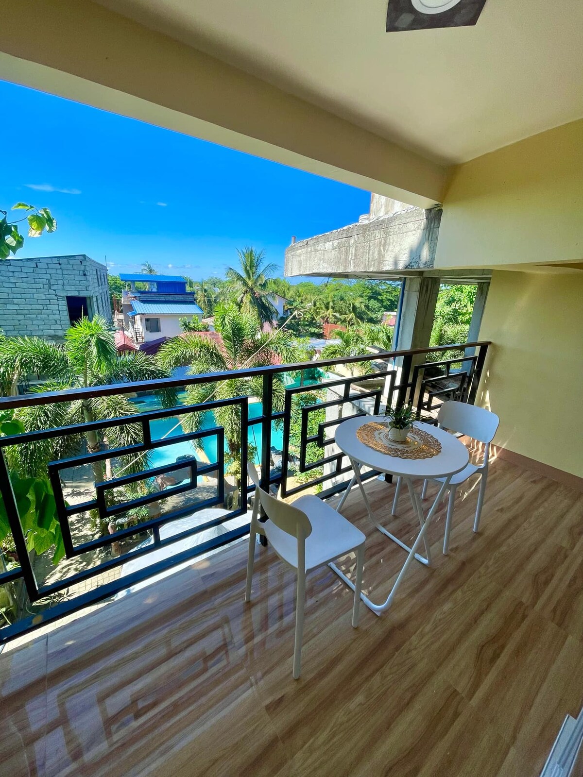 Mga Detalye ng Room 7 – Mamalagi nang 6 -8 pax Ang ✓ kuwarto ay may 1 double size na bunk bed at 2 dagdag na kutson (linen, unan at ekstrang kutson) ✓ May Pribadong banyo at terrace ✓ May naka - air condition + wall fan ✓ Sariling access sa kusina (na may mga kagamitan) ✓ May libreng access sa pool ✓ Mainam para sa alagang hayop ✓ Libreng seguridad sa WiFi at CCTV ✓ Gated parking & generator backup incase ng pagkagambala sa kuryente o mababang boltahe ⚠️ 3 minutong lakad papunta sa beach (hindi sa tabing - dagat) ⚠️ Walang iniaalok na toiletry o tuwalya.