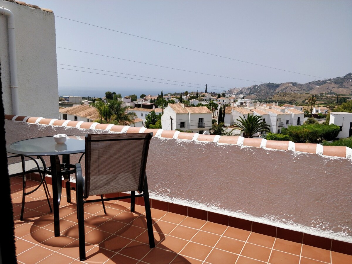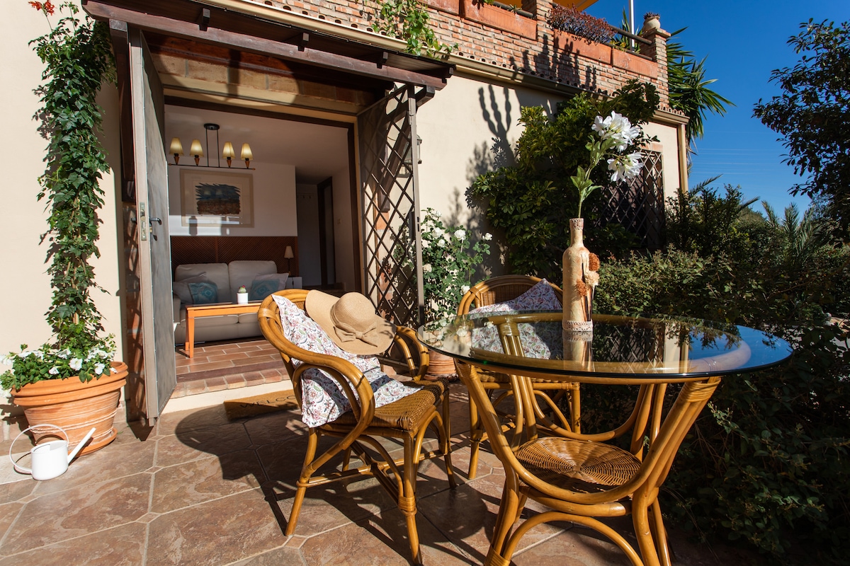 Modernong apartment sa hiwalay at pribadong bahagi ng kaakit - akit na bahay, na may mga tanawin ng dagat na nakaharap sa timog - kanluran na matatagpuan sa magandang hardin. Ilang metro lang ang layo ng iyong pinto sa harap mula sa paradahan at swimming pool! 400 metro lang ang layo mula sa mga tindahan at restawran sa magandang Benalmádena Pueblo, pero nasa tahimik na villa quarter. Makikita sa burol, kaya paitaas ang paglalakad papunta sa nayon. Nakakonekta nang maayos sa mga hintuan ng bus at taxi sa malapit at madaling mapupuntahan ang motorway. Wala pang 2 km ang biyahe mula sa beach.