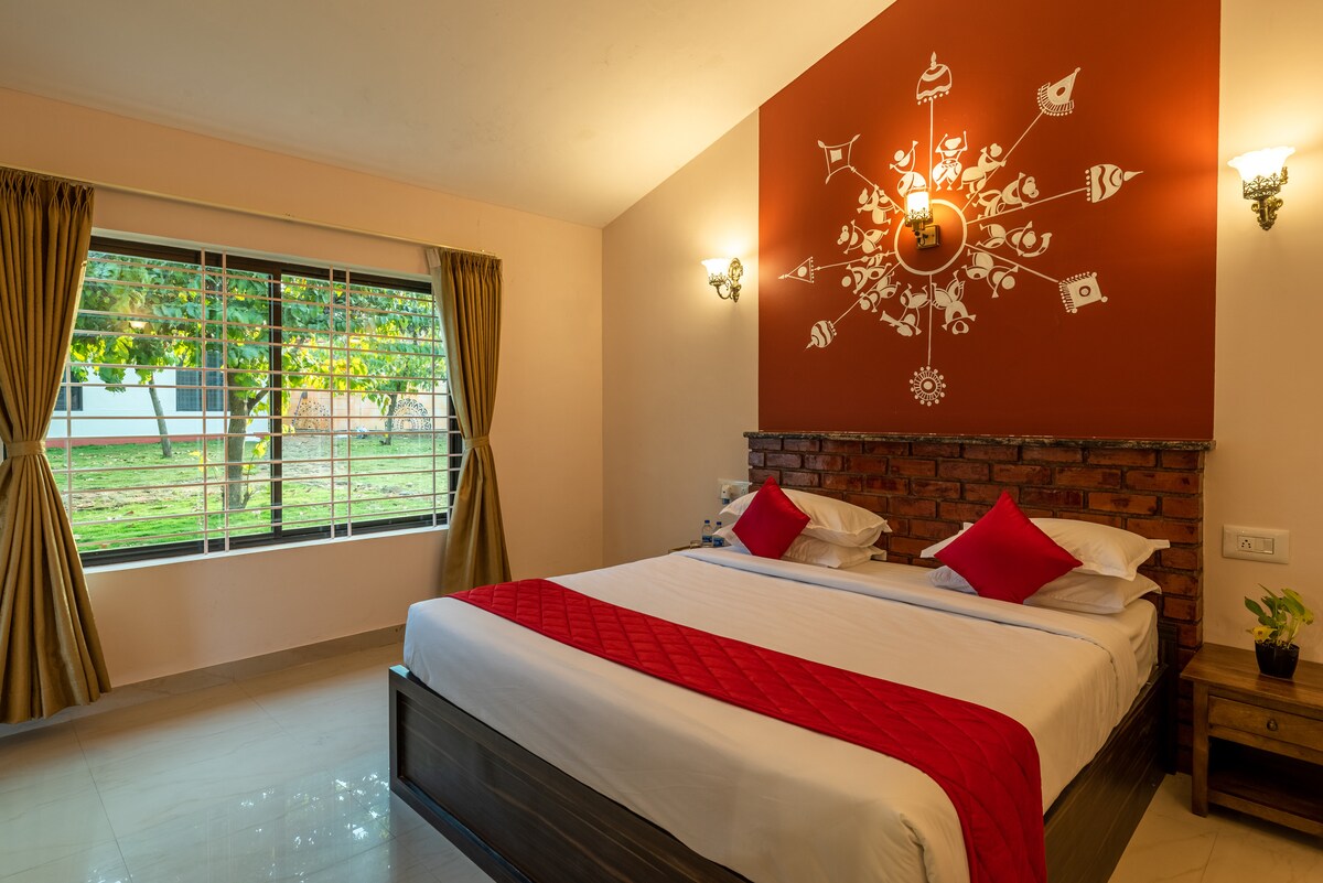 Tucked away in a lush one-acre sanctuary, this pet-friendly mezzanine cottage offers a peaceful escape where nature and comfort come together effortlessly. Inside, high sloped ceilings, warm ambient lighting, and large windows frame calming views of greenery, while a plush king-sized bed and a private loft-style nook add intimacy and charm. Step outside to unwind by the shared swimming pool, enjoy open-air dining, or relax on the expansive lawn with your furry companion.
