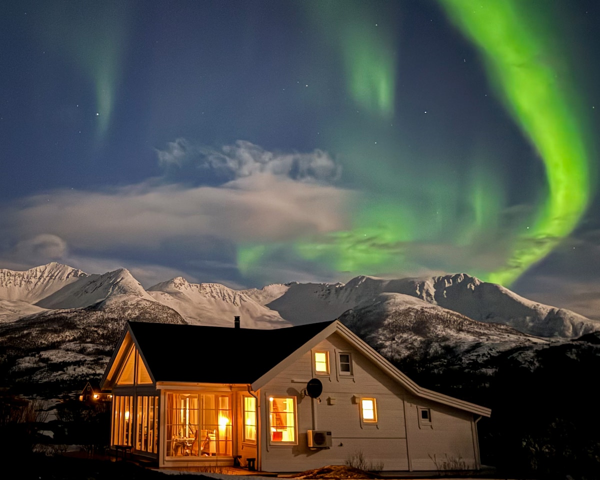 Isang komportable at kumpletong cabin na may personal na touch at magandang tanawin. Perpekto para sa mga mag‑asawang naghahanap ng romantikong bakasyon o mga pamilyang gustong magkaroon ng komportable at di‑malilimutang pamamalagi. Kasama sa pamamalagi ang paggamit ng 2 pares ng snowshoe, bisikleta, pamingwit, at de‑kalidad na kagamitan sa pagkakape. Nasa mismong sentro ng baryo ang cabin na nag‑aalok ng privacy at magandang tanawin. Mag‑enjoy sa midnight sun sa tag‑araw at sa northern lights sa taglamig—mula sa komportableng modernong retreat na ito.