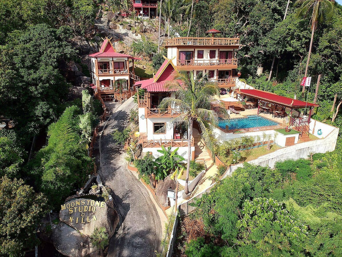 Nag - aalok ang Swiss Management Moonstone Apartment ng natatanging alternatibo sa mga hotel. Matatagpuan ito sa pasukan ng Haadrin sa Sunset Beach side, na matatagpuan sa isang maliit na burol at malapit sa sikat na Fullmoon Party Beach sa isang tahimik na lugar. Nag - aalok ang Moonstone Apartment ng nakamamanghang tanawin ng dagat. Nag - aalok ang 64 sqm Apartment ng silid - tulugan na may king - size na higaan para sa 2 tao, sala na may single - size na sofa bed para sa 1 dagdag na bisita na paunang sinisingil ng Airbnb at maliit na kusina.