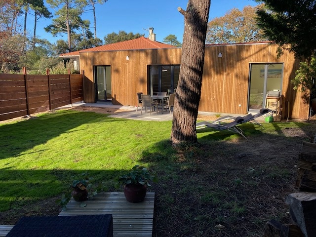 2 silid - tulugan na bagong bahay na 40m2 sa ilalim ng mga puno ng pino na may pribadong hardin. 800m mula sa beach at malapit sa mga daanan ng cycle sa pamamagitan ng kagubatan na magdadala sa iyo sa hilaga sa Capbreton o timog sa Ondres. Access sa pamamagitan ng isang pinaghahatiang landas. 2 silid - tulugan na maaaring iwan ang bawat isa na may king size na mga higaan o nahahati sa 4 na single. Functional Living room/kusina na may lahat ng amenidad at gas griddle para sa panlabas na pagluluto. Kumain ng hapunan sa labas sa Patio at pagkatapos ay dalhin ang aperitif sa sofa sa ilalim ng mga puno.
