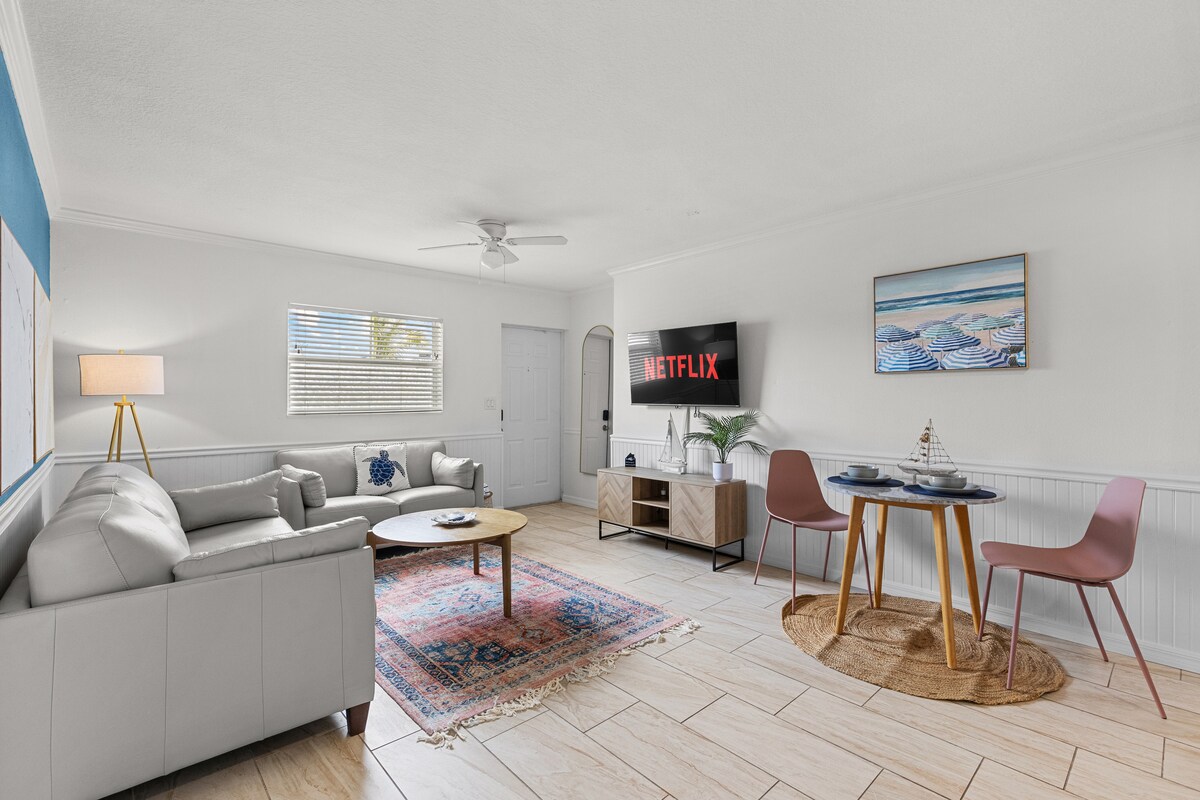 Ang Easy Island na naninirahan sa Minnow 2 ay nais mong manatili nang mas matagal! Kalahati ng duplex sa ground level ang property na ito. Ang maganda at magandang pinalamutian na dalawang silid-tulugan, isang banyo na beach cottage ay may kahoy na sahig sa buong. May dalawang kuwarto ito na may king bed sa bawat isa at kayang tumanggap ng hanggang apat na tao sa kabuuan. Kung mas marami ang kasama mo, pagāisipang ipagamit ang Minnow 1 na kabilang bahagi ng duplex para makapamalagi ang 6 na tao sa kabuuan.