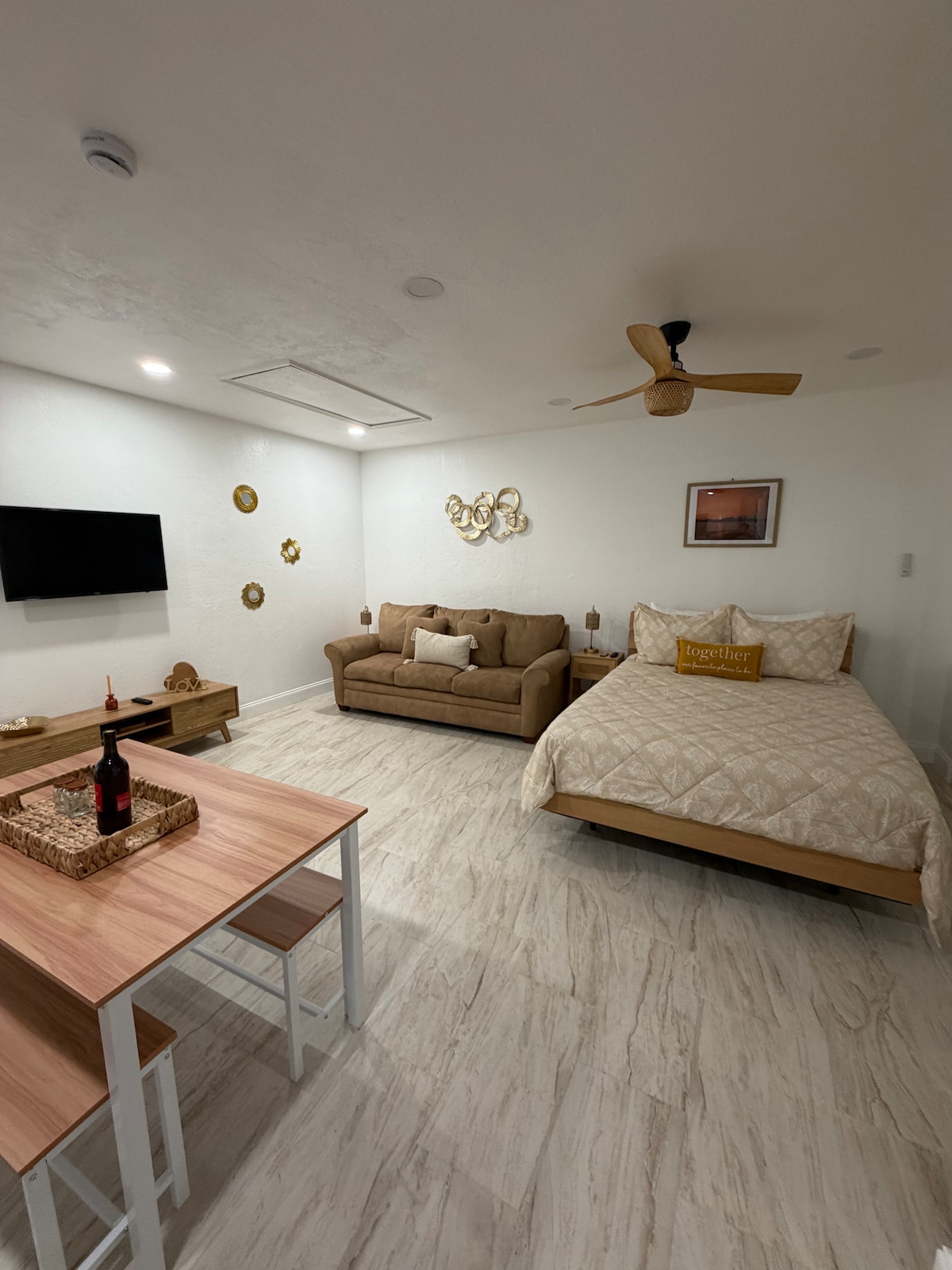 Manatili sa aming bagong ayos na istilong studio na muwebles na may queen size bed. May mini refrigerator na may microwave, coffee keurig na may komplementaryong Starbucks k cups.Free wifi at 50 inch tv na nakaharap sa kama . 5 min sa akademikong img, 15 min ang layo mula sa Coquina ,Ana María Island at SRQ airport.