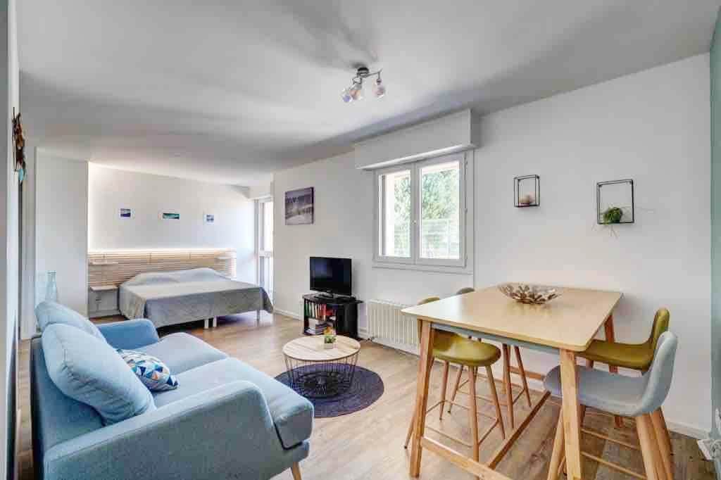 Malaking maliwanag na studio, tahimik, na - renovate lang, nag - aalok ang Evasion ng mapayapang kapaligiran na may natural at kontemporaryong dekorasyon na lumilikha ng mainit na kapaligiran. May perpektong lokasyon na 150 metro mula sa lawa, sa ligtas na tirahan na may elevator, sa ika -3 palapag, malaking balkonahe, pribadong paradahan sa ilalim ng lupa at mga bisikleta (mga mountain bike ) na available. Nasa dulo ng kalye ang lahat ng tindahan! Sampung minutong lakad ang makasaysayang sentro, 3 minuto ang lawa. 2 tao ang makakatulog: isang queen size na higaan