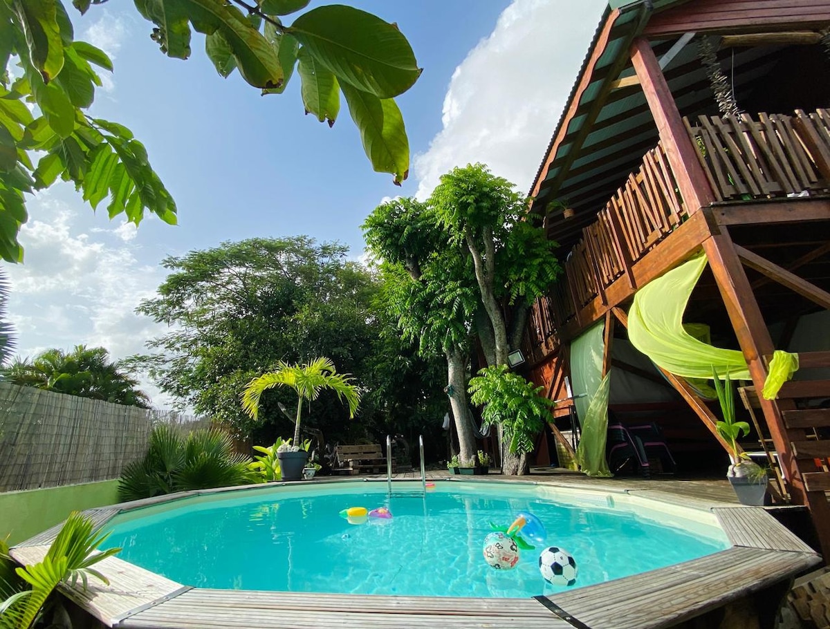 Ang "Ti Gwapabe", na may lawak na 75 m2, na may swimming pool, pasukan at independiyenteng paradahan. Kasama sa tuluyang ito ang maluwang na kuwartong may higaan na 2 pers (160x200) at mga damit para sa pagbibihis, banyong may walk - in na shower, sala na may sofa bed, silid - kainan, kusinang may kagamitan na may pagbubukas sa bar, terrace na 40m2 na may swimming pool na "punch bin" (3m/3m) - mga deckchair - muwebles sa hardin. Isang nakatalagang 1200l water buffer tank. Ikalulugod naming i - host ka sa maliit na sulok ng paraiso na ito;)