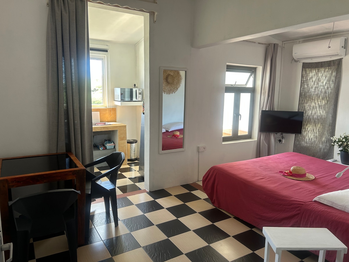 50 metro kami mula sa pinakamagagandang beach sa Rodrigues, Saint Francois beach, at 30 minuto mula sa Trou D 'argent na naglalakad. 300 metro ang layo ng Studio mula sa terminal ng bus, at may paradahan para sa iyong kotse. Maaliwalas, malinis, ang studio ay may 1 double bed, isang banyo na may shower, isang maliit na panlabas at panloob na lugar ng kusina (refrigerator, oven, microwave, kettle, atbp...) at isang sea view terrace. Nilagyan din ang kuwarto ng bentilador.
