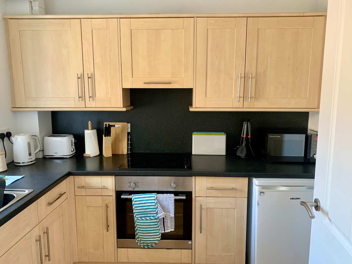 Ang net house ng isang fisherman ay ginawang isang modernong flat na hardin na may kumportableng sofabed at silid - tulugan. Ang Sofabed ay isang malaking double bed na nagpapahintulot sa 4 na tao sa kabuuan na makatulog nang komportable sa flat. Nilagyan ng breakfast bar at washing machine ang kusina. Toilet na may shower cubicle. Pribadong hardin na may electric BBQ. Kailangan na naming ipakita ang aming rating sa Enerhiya: C