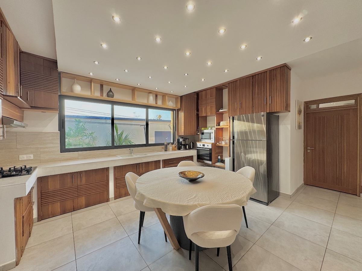 Ang villa na ito ay may tatlong naka - air condition na silid - tulugan na may king size na higaan (180cm / 200cm), na nilagyan ang bawat isa ng dressing room, pribadong banyo na may shower, vanity at toilet, na may baby bed. Mayroon ding 35 m2 salt pool, na nilagyan ng upuan, para makahigop ka ng baso habang tinatangkilik ang tanawin ng hardin. Posibleng pag - alis mula sa lahat ng ekskursiyon ng bahay. Bangka, Quad, Kabayo...