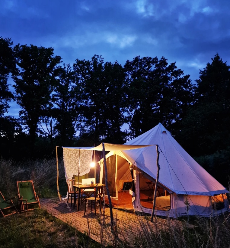 Mayroon kaming glamping tent at chalet na ganap na pribado para sa mga bisita. Maaari nilang gamitin ang sauna at heated swimming pool (33°~36°) Heated outdoor shower Kami ay ganap na matatagpuan sa kalikasan, maaari kang gumawa ng kahanga - hangang paglalakad, pati na rin ang bike o mountain biking o lamang tamasahin ang mga magagandang berdeng landscape Sa umaga sinisira namin ang aming mga bisita ng isang kahanga - hangang almusal. Ang aming layunin ay upang bigyan ang mga tao ng kapayapaan at hayaan silang kalimutan ang lahat.