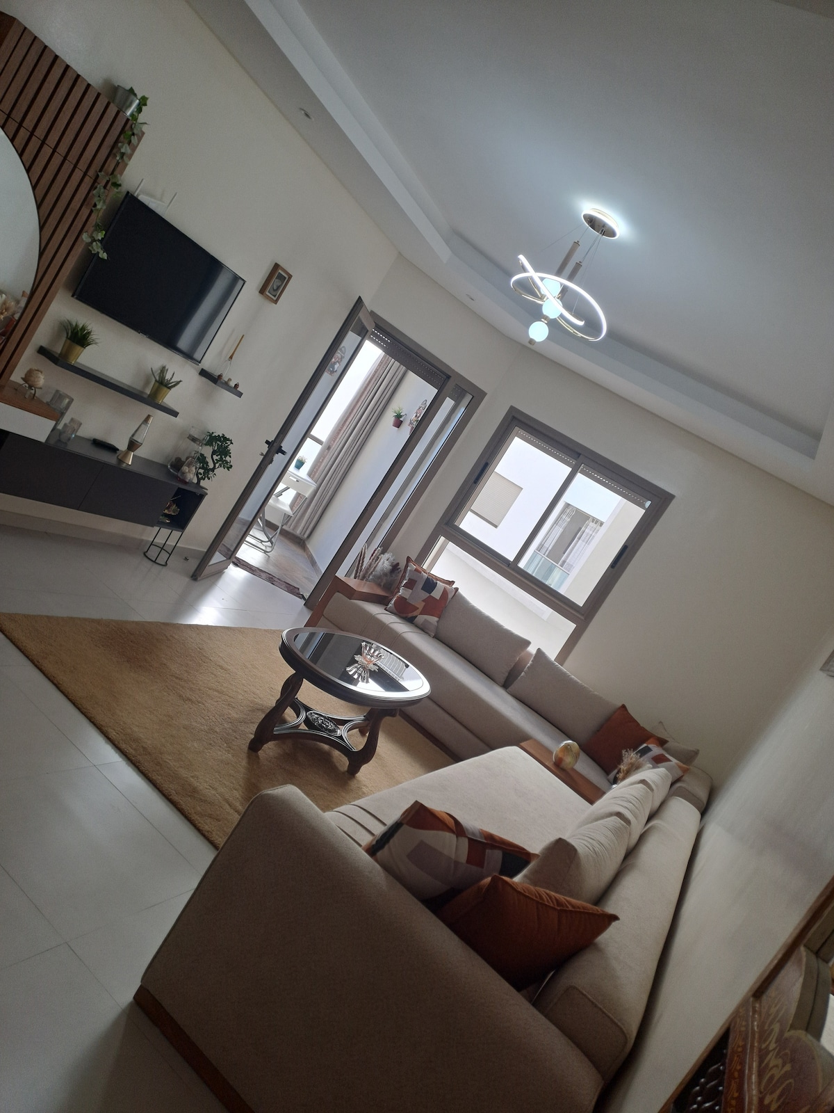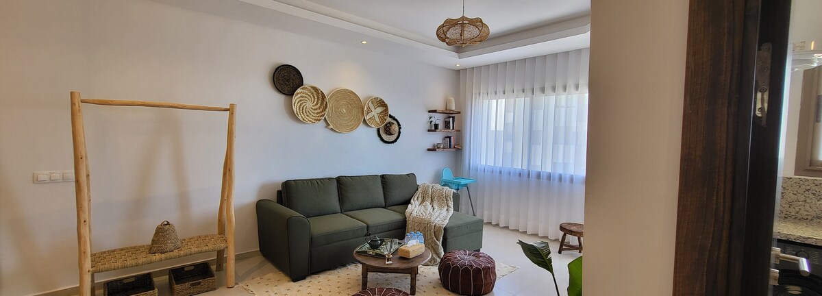 Maganda ang maluwag at maayos na apartment sa unang palapag. Matatagpuan sa isang tahimik na lugar, 5 minuto mula sa Agadir, 10 minuto mula sa mga beach ng Taghazout, at napakalapit sa beach ng Anza (tandaan na ang lungsod ng Anza ay masyadong binisita ng mga mahilig sa surf at sa beach na mas mababa sa 500 metro ang layo ) . Ang accommodation ay napaka - angkop sa mga mag - asawa na may o walang mga anak .Ang akomodasyon ay hindi maaaring kumuha ng mga reserbasyon para sa mga mag - asawang walang asawa na Moroccan.
