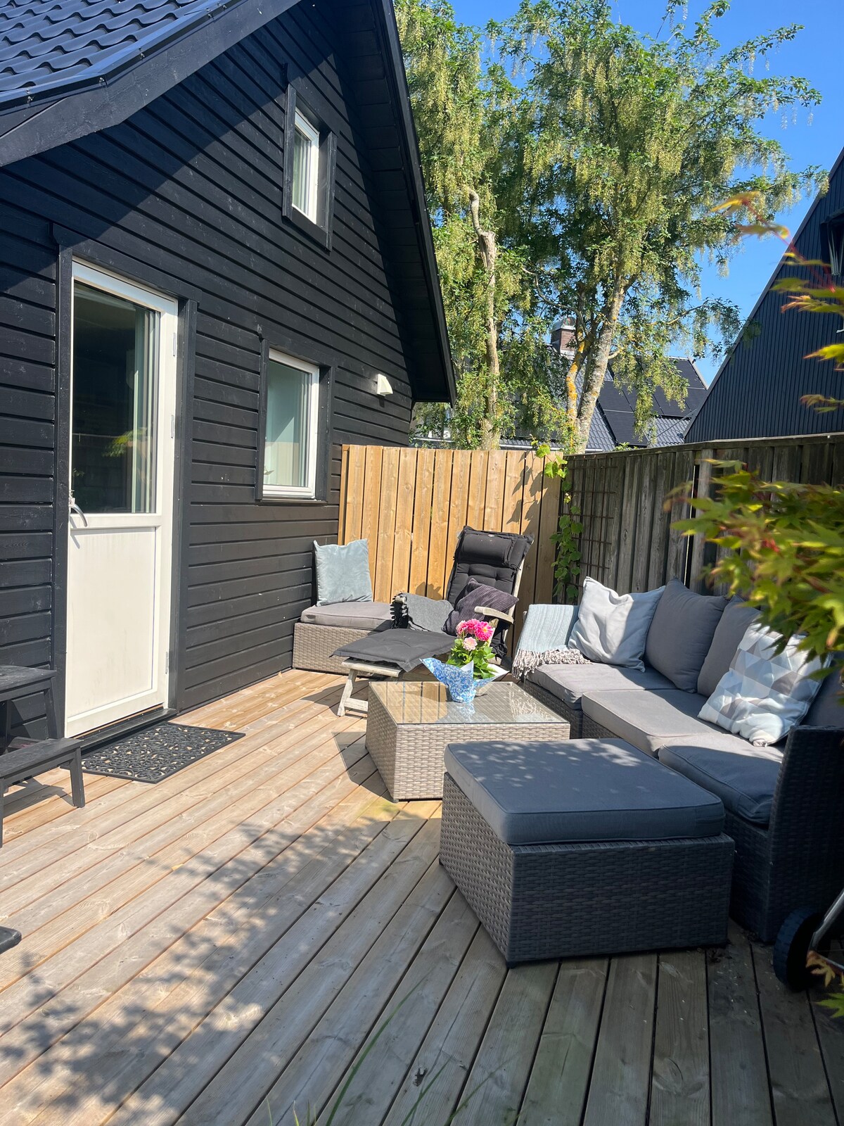 (TANDAAN: lingguhang inuupahan ang v26-29 mula Linggo hanggang Linggo na may mandatoryong karagdagang bayad sa paglilinis na SEK 1000, pero may 10% diskuwento bilang lingguhang diskuwento sa kabuuang upa). Bagong itinayo na guest - apartment na idinisenyo ng arkitekto sa likod ng tahimik na lugar na may kamangha - manghang kapaligiran. Maikling lakad papunta sa beach at pagbibisikleta papunta sa sentro ng Varberg. WELCOME SA AMING TAHANAN🌸