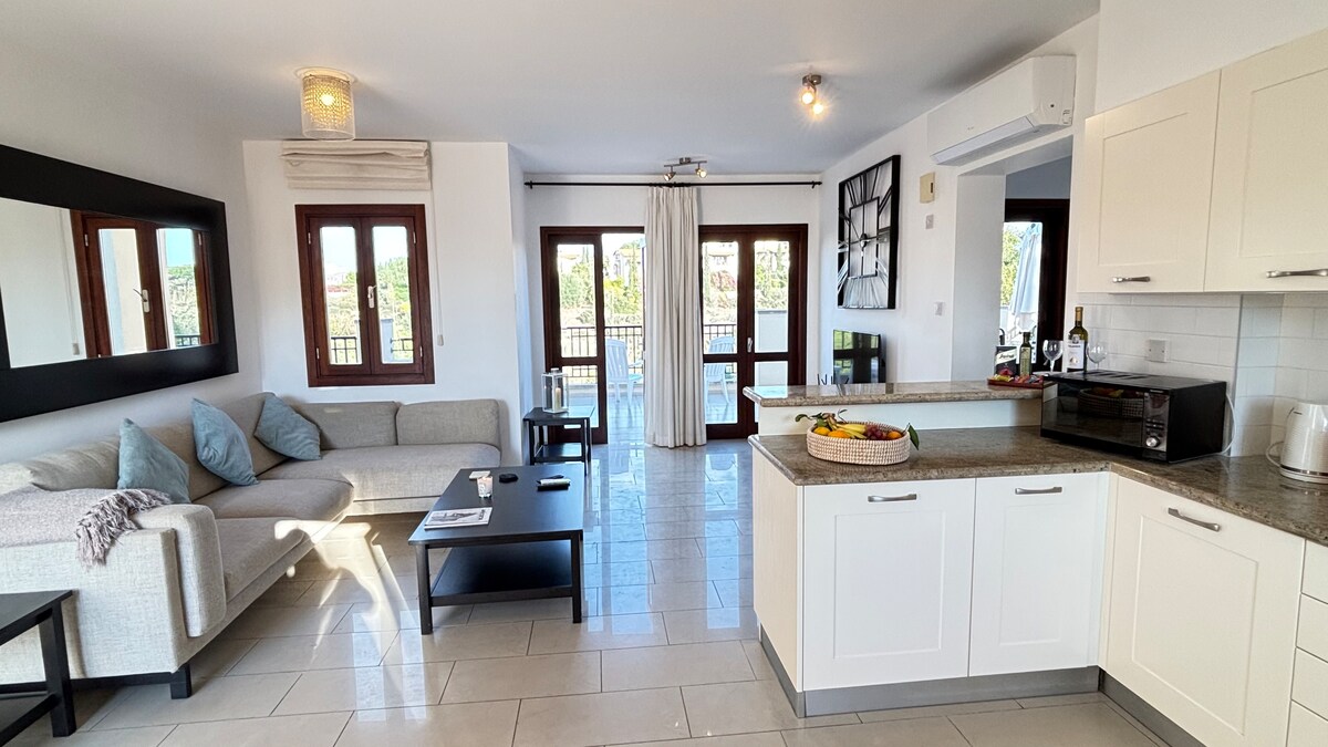 Bumalik at magrelaks sa kalmado at naka - istilong tuluyan na ito kung saan idinisenyo ang lahat para sa iyong kaginhawaan, kaginhawaan, at pagpapahinga. Matatagpuan ang 2 bedroom home na ito sa ilalim ng duplex sa hinahangad na Adonis Village sa prestihiyosong Aphrodite Hills resort complex. Tangkilikin ang kaginhawaan ng pananatili sa isang resort na nag - aalok ng golf, spa life, tennis, at hindi kapani - paniwalang restaurant na may privacy ng iyong sariling espasyo. Ipinagmamalaki ng village ang communal pool at mga tanawin ng dagat.