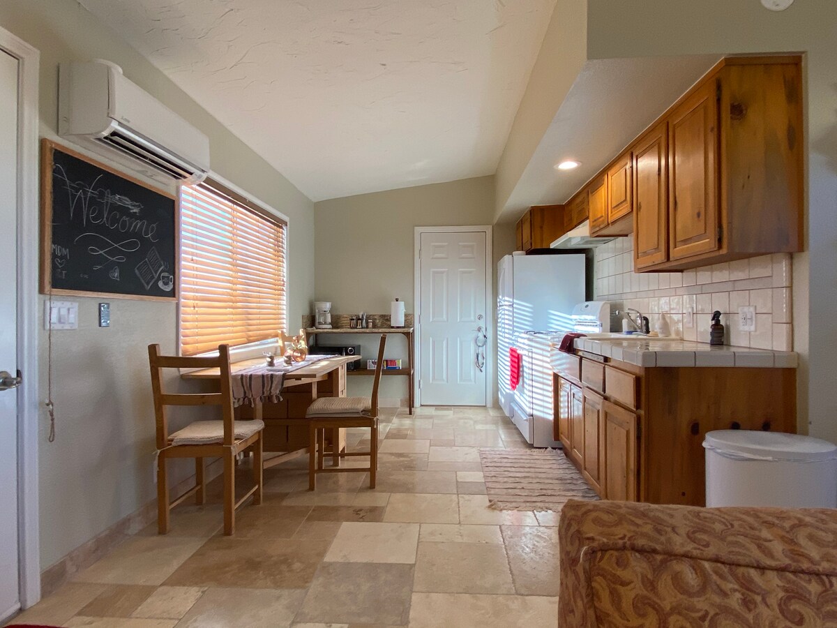 Maaliwalas na Studio sa tuktok ng burol sa 5 ektaryang lupa. Ganap na pribado na may nakamamanghang tanawin ng lambak sa araw at gabi.. Lahat ng kailangan mo ay narito para masiyahan sa nakakarelaks na paglubog ng araw o uminom ng iyong paboritong kape habang pinagmamasdan ang magandang pagsikat ng araw. Tingnan ang kalangitan sa gabi habang umiinom ng isang baso ng alak.Makakaramdam ka ng milya - milya ang layo, pero wala pang 10 minuto ang layo ng lahat ng kaginhawaan sa tindahan. Halika at tamasahin ang nakakarelaks na katahimikan ng Apple Valley. Nakakarelaks na maliit na trail sa paglalakad sa harap ng bahay. 4 na minuto lang ang biyahe sa burol papunta sa lokasyon.