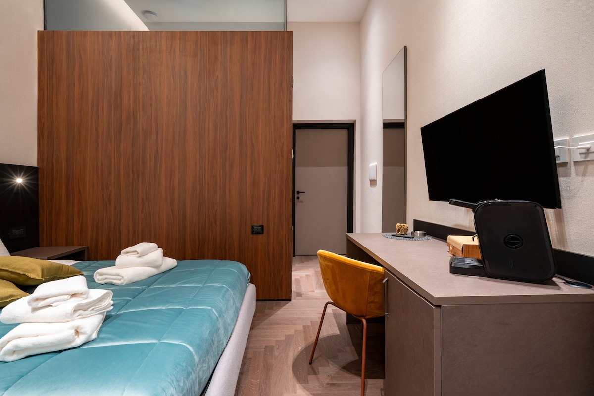 The apartment in a hotel 4 season cognetti room 2 with step-free interior is located in Bari and is perfect for an unforgettable holiday with your loved ones. The 16 m² property consists of a living room, 1 bedroom and 1 bathroom and can therefore accommodate 2 people. Additional amenities include high-speed Wi-Fi (suitable for video calls), a TV as well as air conditioning. A baby cot is also available.