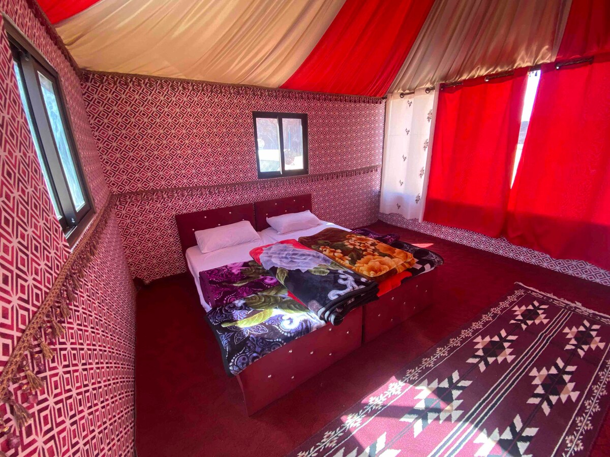 Magdamag sa mararangyang Bedouin Tent sa gitna ng Disyerto ng Wadi Rum Binubuo ang marangyang Tent na ito ng 3 single - sized na higaan sa pribadong kuwarto na may banyo at panoramic window na humahantong sa pribadong terrace na may kamangha - manghang tanawin sa disyerto. Bibigyan ka ng mga tuwalya, shampoo, at libreng tubig. Kasama rito ang almusal sa common room. Ang paglipat mula sa nayon ay 10JD/tao kung hindi ka magbu - book ng tour sa amin.