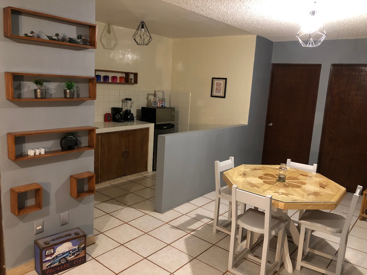 Disfruta de una estancia cómoda y relajante en este acogedor departamento ubicado en una zona muy segura y tranquila, a tan solo 5 cuadras del parque Miguel Hidalgo y a 3 cuadras de bramido. Ideal para familias pequeñas, parejas o viajeros que buscan una experiencia unica, comodidad y una muy buena ubicación.