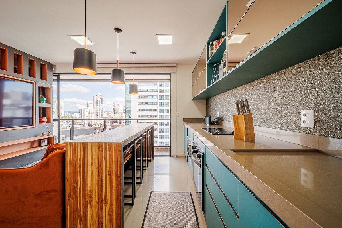 Ang kahanga - hangang apartment sa sentro ng Joinville, na matatagpuan 150mts mula sa Mueller Shopping Mall, ay may 1 suite at 1 silid - tulugan at buong banyo. Available ang kumpletong kusina na may modernong kagamitan (induction cooker, microwave, electric oven, coffee maker, refrigerator) para sa mga gustong magluto. Ang apartment ay nasa ika -18 palapag at may 42"smart TV, fiber optic internet at barbecue sa balkonahe. Sa mga safety nets sa buong apartment. 150mts mula sa Gastronomic Way of Joinville.