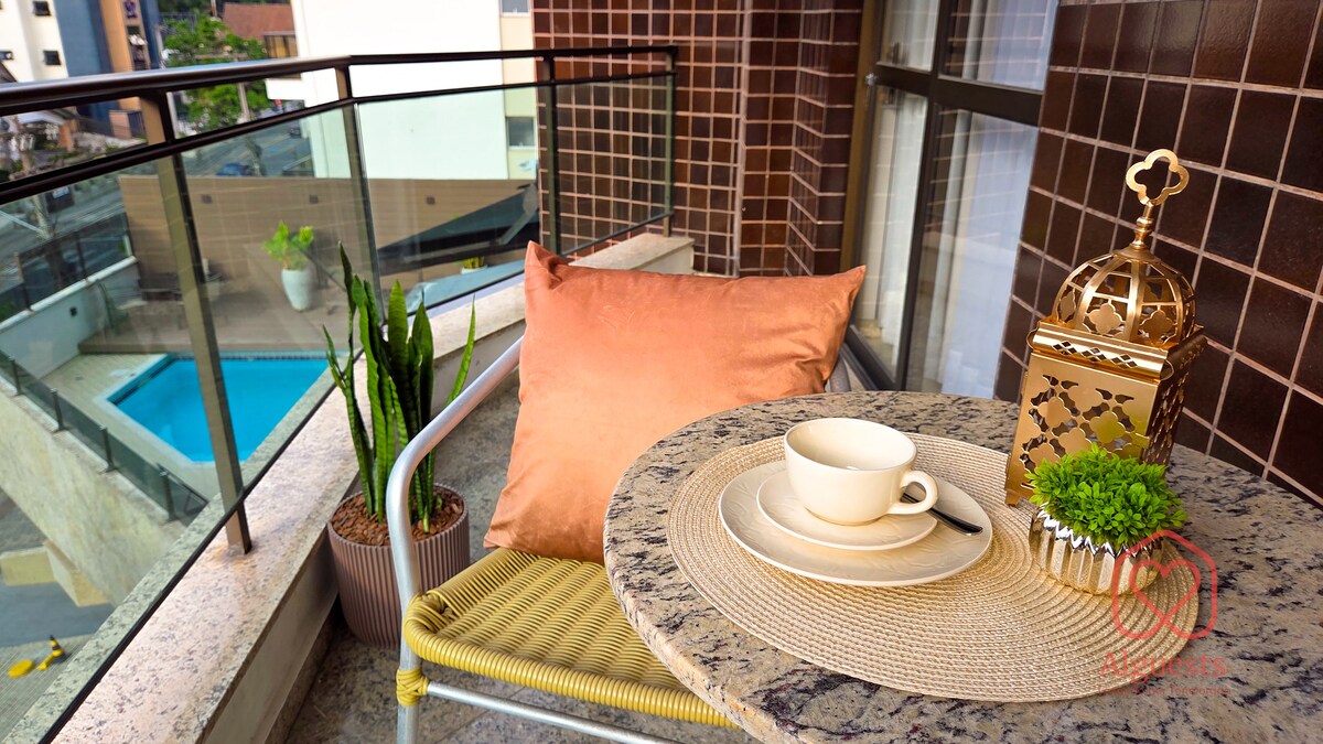 Apt sa isang mataas na palapag, sa Center of Joinville na may 1 suite na may queen bed + 1 sofa bed + lavabo. Barbecue area sa balkonahe. Smart TV at wifi. 100 metro ng Via Gastronômica at Shopping Mueller. 01 Km mula sa Centreventos Cau Hansen. Kusina na may induction stove, microwave, air fryer oven, Nespresso coffee maker, electric kettle at mga kagamitan. Available ang kolektibong labahan sa gusali nang may karagdagang gastos. Mayroon ding swimming pool, fitness center*, sinehan*, at meeting room ang gusali *. *conf. agenda ng availability *