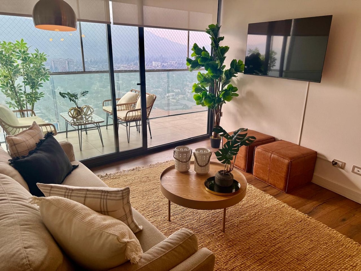 Bagong apartment kung saan matatanaw ang Parque Araucano at Cordillera. Mga hakbang mula sa mall na Parque Arauco, mga restawran, bar, supermarket, bangko at network ng metro. 1 Silid - tulugan at 1 Banyo. Sofa/kama o kutson. Walk - in closet, TV na may mga streaming service. Kumpletong kusina. Work desk. Paradahan (may bayad). Ligtas na gusali. Labahan, temperate pool, sauna, outdoor pool, gym, quincho para asados at event room. Minimarket sa gate at room service para sa mga order ng pagkain!