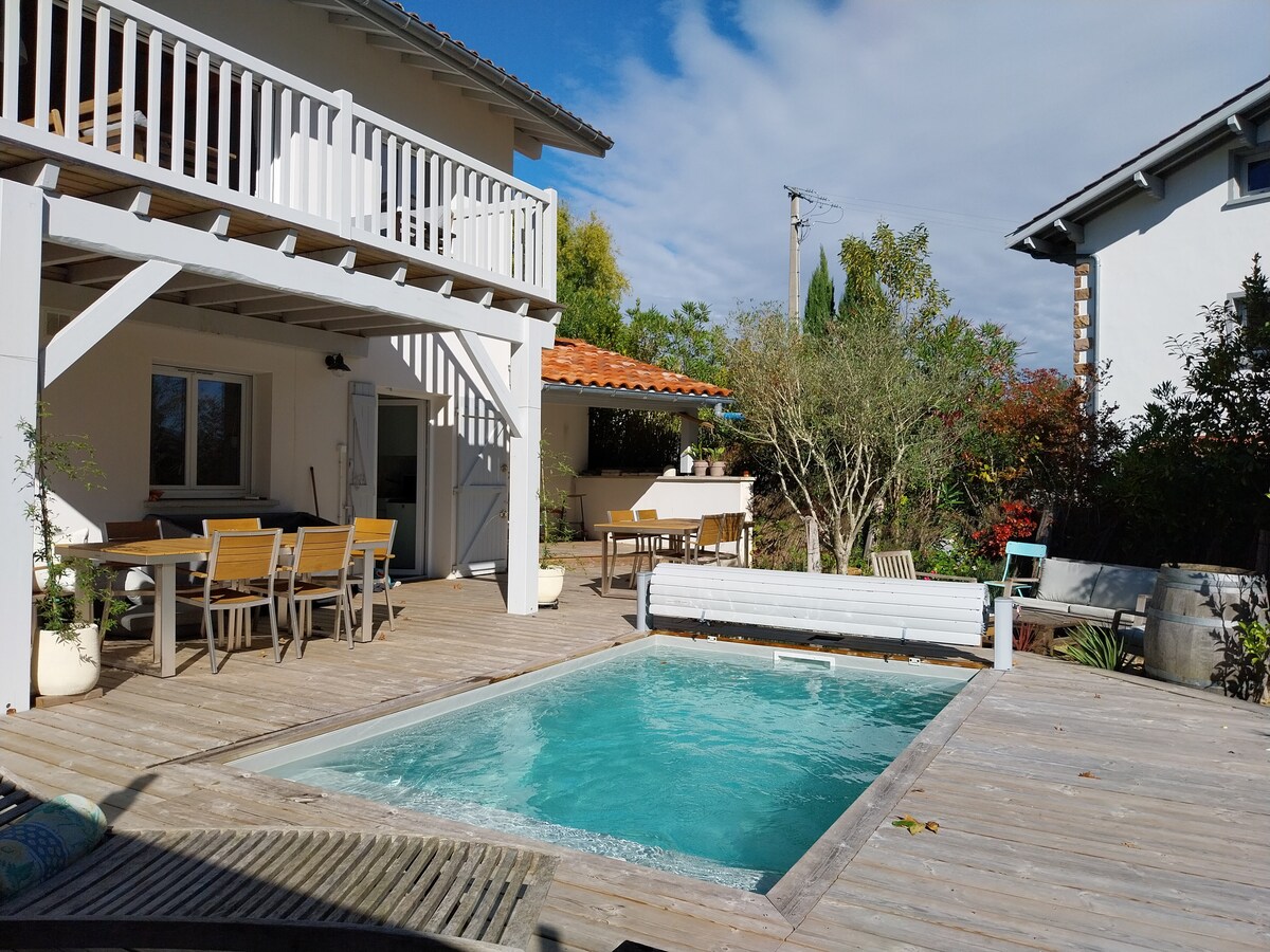 Ang kanayunan sa tabi ng dagat. Medyo independiyenteng bahay na nakaharap sa timog sa isang makahoy na hardin na nakaharap sa isang malaking swimming pool (13 mx4.50 m). Ikaw ay nasa kanayunan ngunit 1 km mula sa beach ng Bidart at 10 minuto sa pamamagitan ng kotse mula sa Biarritz at Saint Jean de Luz.