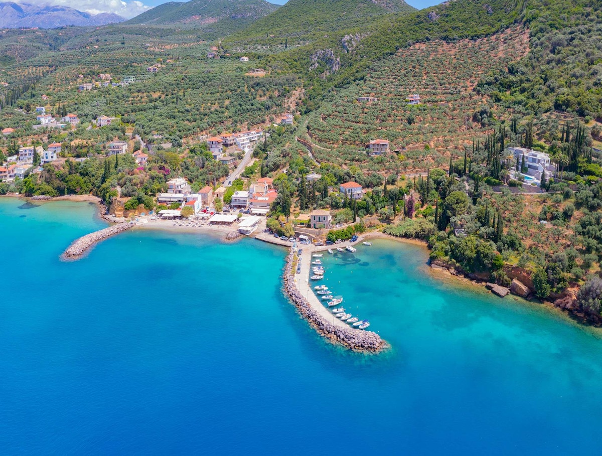 Natatanging villa sa harap ng dagat na may 1 palapag na ginagawang lubhang functional ang bahay. Maganda ang tanawin ng paligid dahil sa mga hardin kung saan puwede kang mag-almusal, magtanghalian, o maghapunan habang nasisiyahan sa tanawin ng Argolic Gulf. Natatangi ito dahil sa lokasyon nito dahil mayroon itong direktang access sa isang mabuhanging beach na may malinaw na tubig.