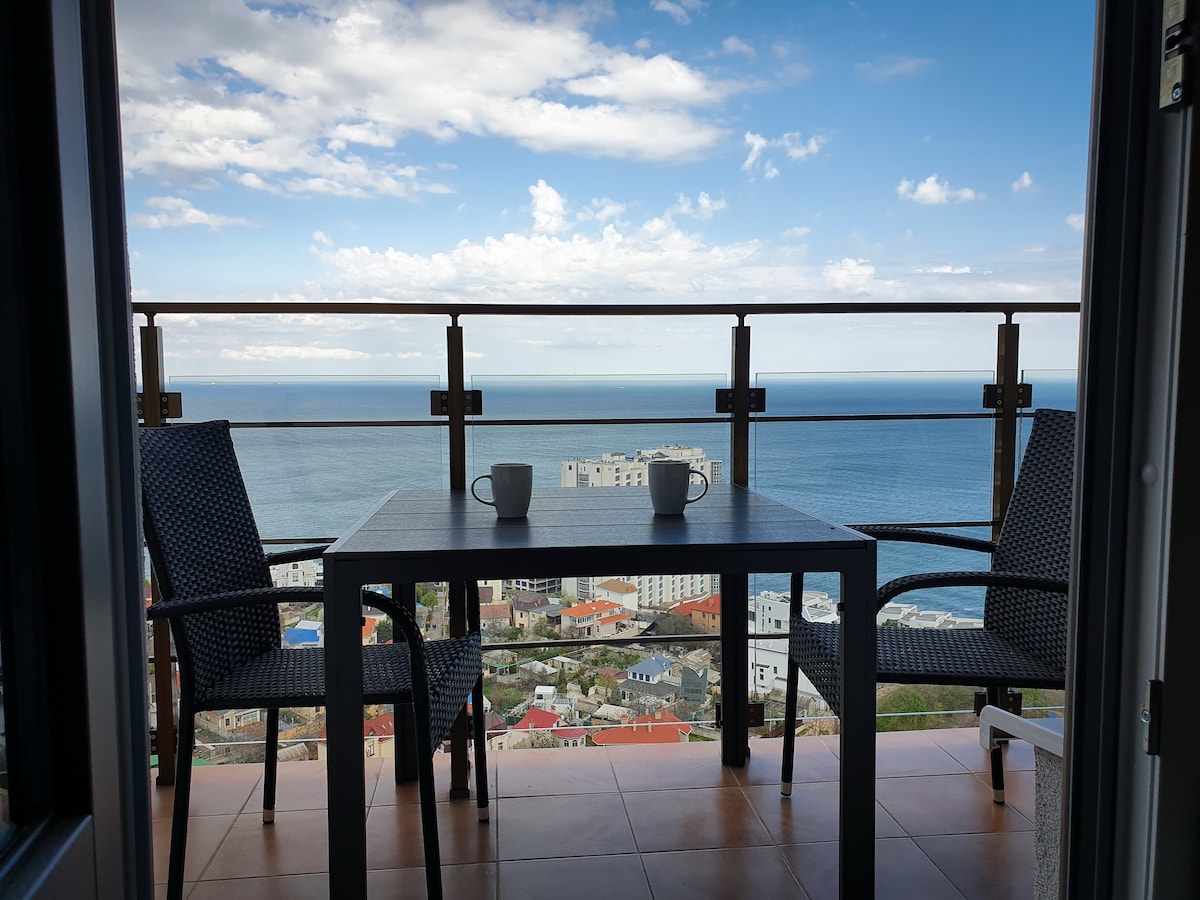 Ang apartment na may sukat na 90 sq. m. na nasa ika-20 palapag ng 23-palapag na residential complex na "Gagarin Plaza" sa gitna ng Arkadia na may magandang tanawin ng dagat. Ang teritoryo ng bahay ay binabantayan sa lahat ng oras. Ang pasukan at entrada ay para lamang sa mga bisita at residente. Ang apartment ay kumpleto sa lahat ng kailangan para sa isang komportableng oras at pahinga. May generator sa bahay para sa elevator at tubig hanggang 23:00 Sa loob ng apartment, may backup power supply (gagana ang wifi, TV, ilaw, refrigerator) 5 minutong lakad ang layo mula sa bahay ang mga sikat na club, beach, restaurant at marami pang iba.