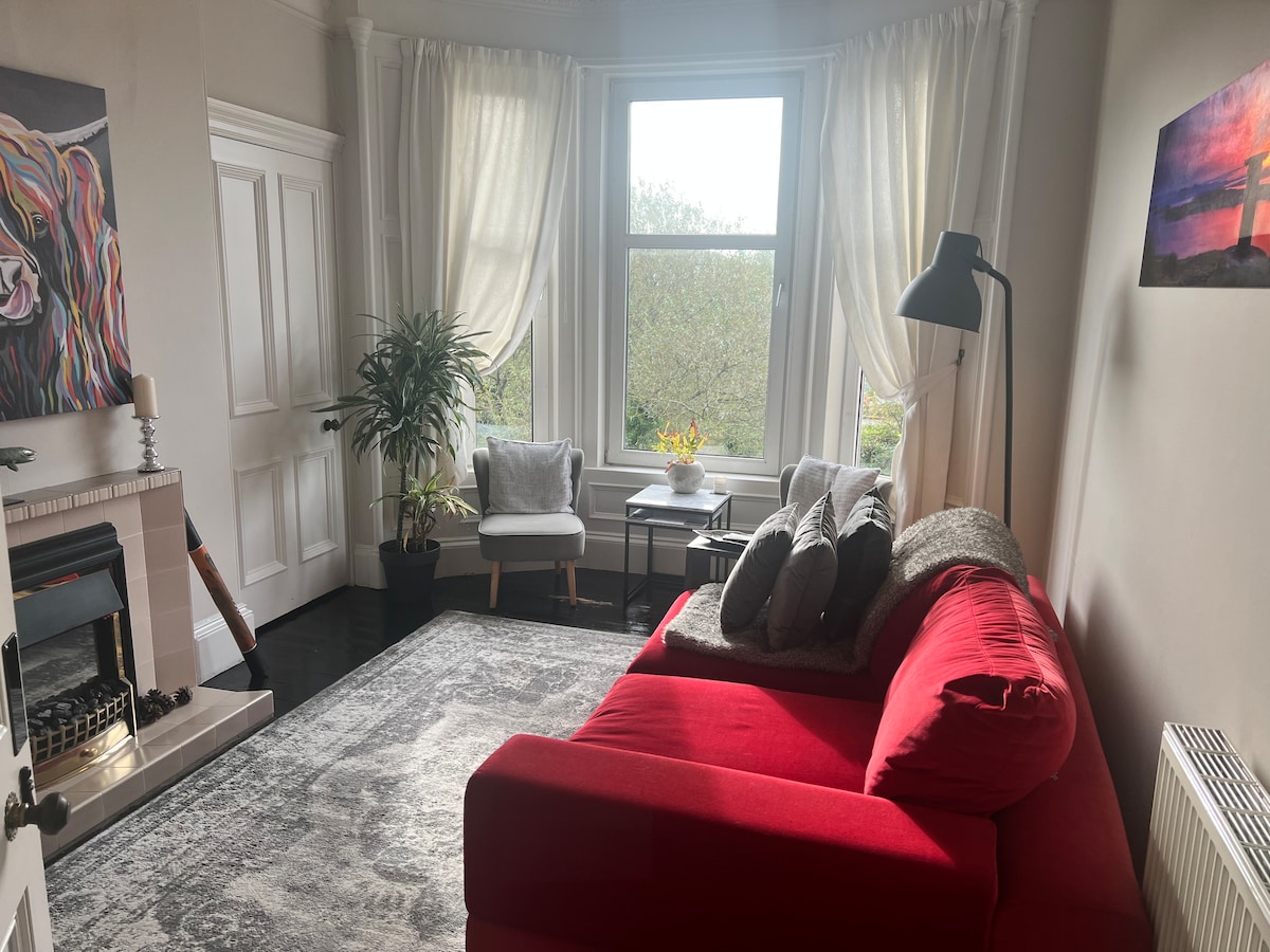 Ang property ay may 2 sala at maaaring i - configure ang isa bilang isang malaking double bedroom, mangyaring ipaalam sa akin kapag nagbu - book kung paano mo ito gustong i - set up. May king size sa main bedroom at bunks sa kabila. Victorian flat na may ilang orihinal na feature. Isang gateway papunta sa Arran, Ayrshire at higit pa . 15 minutong lakad ang 2 beach. Wala pang 3 minutong lakad ang mga tindahan, takeaway, at kastilyo rin. 15 minuto ang layo ng ASDA at iba 't ibang restaurant mula sa property.