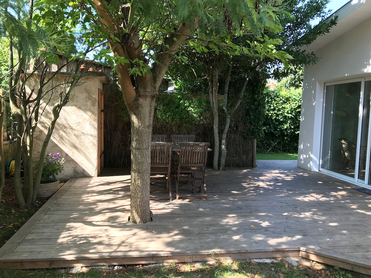 Sa mga pintuan ng Cap Ferret peninsula, isang naka - air condition na independiyenteng chalet, na matatagpuan 600 metro mula sa sentro ng lungsod kasama ang merkado, beach, maliliit na tindahan (paglalaba, panaderya, tindahan ng karne, tindahan ng karne, supermarket, atbp.). Malapit sa kagubatan at malaking beach ng Atlantic Ocean 8 km ang layo. Agarang malapit sa daanan ng bisikleta (pautang ng 2 bisikleta). 10 lakad, makikita mo ang isang Transgironde bus stop sa Bordeaux at Cap Ferret. Airport 42 km ang layo.