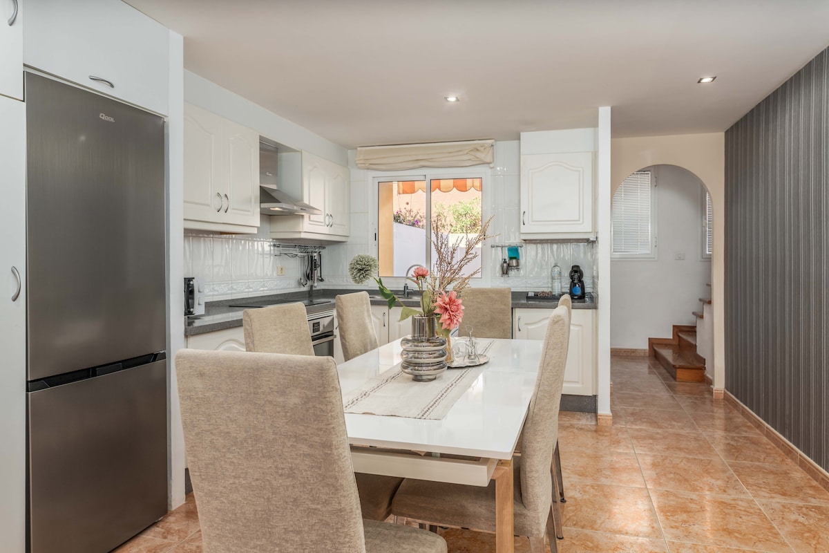 We have the perfect holiday spot for you!! Located in the Costa Adeje, San Eugenio area is this chic and stylish 2 bedroom villa with a private pool. There is an open-plan kitchen-living área that boasts a very cozy atmosphere. You can enjoy delicious meals on the breakfast bar and also get comfortable on the sofa in front of the 46 inches Smart TV. The exterior of the property is situated in a slightly elevated position which results in sea views from the terrace. Family discount available.