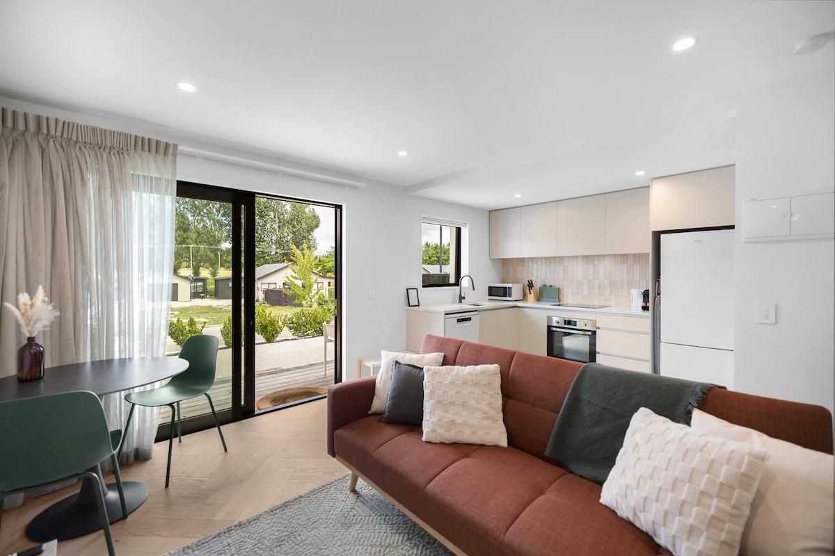 Welcome to our modern oasis! Experience luxury in our newly-built studio apartment, boasting a beautiful Valentino-tiled bathroom with dual showers, underfloor heating, and a heated towel rail. The ambiance is enhanced by solid timber floors and a cozy fireplace in winter months. Indulge in relaxation on your private back deck, complete with a luxurious standalone bath. Meanwhile, the front deck offers serene garden views onto the Arrowtown reserve, with the tranquil river as your backdrop.