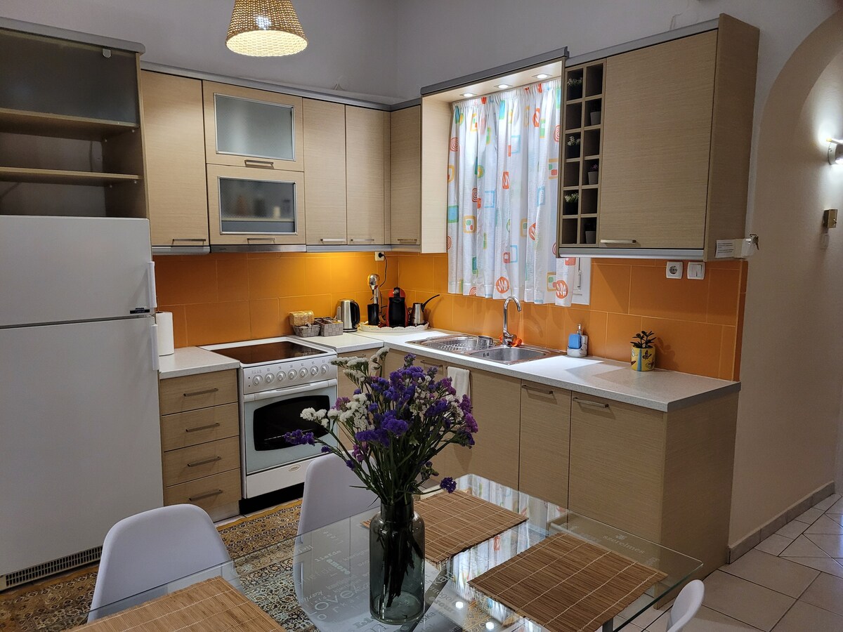 Matatagpuan ang property na ito na parang mula sa fairytale at napapaligiran ng luntiang halaman sa loob lang ng 15 minuto mula sa lungsod ng Trikala. Perpekto para sa pamilya o grupo ng mga kaibigan, pinalamutian ito nang may paggalang sa tradisyon at kalikasan! Huwag palampasin ang natatanging pagkakataon para sa bakasyon! May libreng wifi at paradahan sa kalye para sa mga bisita!
