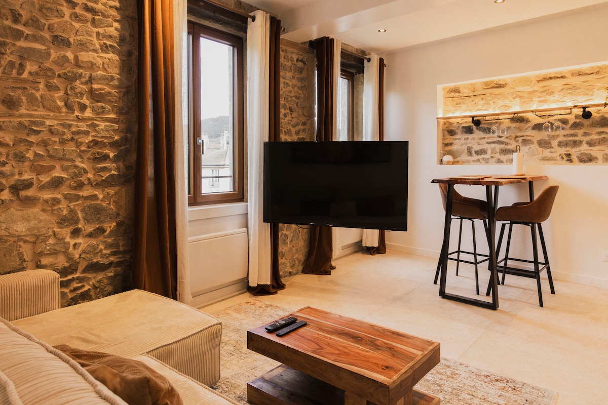 Maluwag na apartment,malapit sa mga tindahan, 5 minutong lakad Tamang - tama para sa isang gabi o isang pamamalagi upang tamasahin ang mga aktibidad sa paligid Matatagpuan sa isang fully renovated , kumportable at naka - air condition na 1800s na gusali ng bato. Kusinang kumpleto sa kagamitan, dining area, workspace na may wifi Dalawang Sofa na Kuwarto sa Sofa Banyo na may Italian shower Plantsa at plantsahan Bilang karagdagan: posibilidad ng pag - access sa pribadong espasyo: spa hammam sauna at aesthetic treatment sa pamamagitan ng appointment