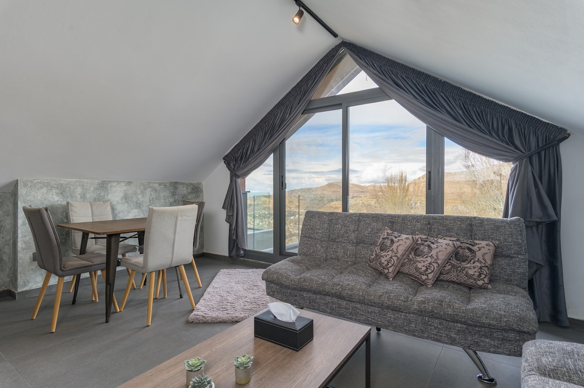 Magbakasyon sa eleganteng duplex chalet na may dalawang kuwarto sa Tilal Al Assal‑Faraya na may pribadong hardin, maaliwalas na fireplace, at magagandang tanawin ng bundok. Perpekto para sa mga pamilya, magkasintahan, o munting grupo na naghahanap ng tahimik na bakasyunan sa bundok. Ilang minuto mula sa Mzaar Ski Resort Kuryente sa lahat ng oras Fireplace at heating Mabilis na Wi - Fi Kusina na kumpleto ang kagamitan Libreng paradahan Pribadong pasukan
