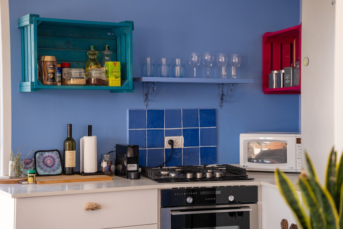 Isang kaakit - akit na pribadong bahay na may malaking hardin at mga pana - panahong puno ng prutas, sa gilid mismo ng kamangha - manghang disyerto. Mainit at nakakarelaks na lugar na matutuluyan. Mainam ang bahay na ito para sa isang bisita, mag - asawa o buong pamilya na hanggang 6 na bisita (Basahin pa ang mga kaayusan sa pagtulog)