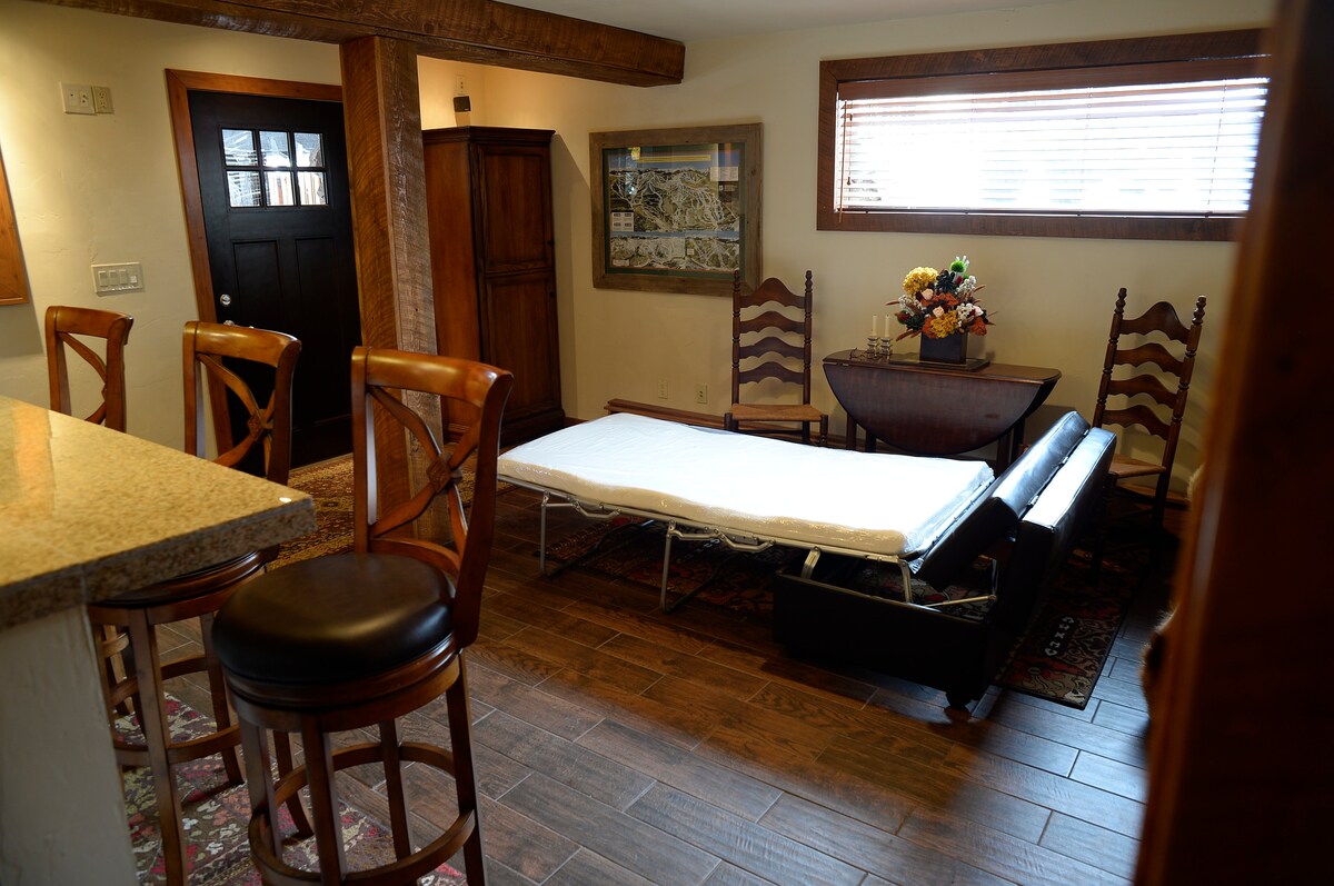This is a charming Studio room with breakfast bar & private bath, it is part of our single family home, that has 2 entrances - one is your own private off the driveway, includes ski storage. Robes & slippers , a mini kitchen - for late night snacks or morning oatmeal & coffee . Murphy -bed QUEEN size , single hide-a- bed & a full bath. Laundry ( shared with us ), 2 TV's, high speed internet, shared Hot Tub , Continental Breakfast , non smoking, short walk TOV Bus, Parking - 1 car.
