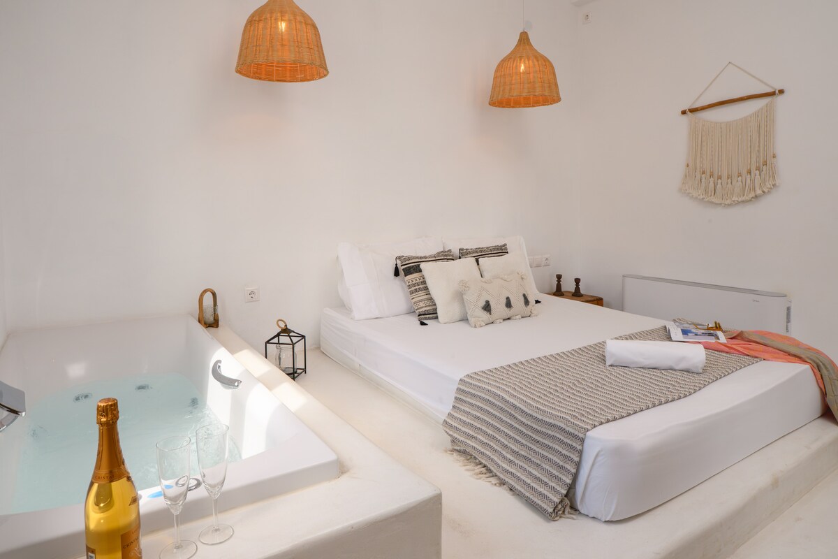 Ang Deluxe Studios ay mga eleganteng, kumpletong kagamitang studio na matatagpuan sa unang palapag ng complex. Mayroon itong double bed, desk at wardrobe na may full-length mirror, fully equipped na kitchenette na may refrigerator, dining table at stool, at isang luxurious bathroom na may shower. Nag-aalok ang mga ito ng direktang access sa bakuran na nasa hangganan ng beach ng Pera Gialos, na may natatanging tanawin ng Chora at ng Venetian castle.