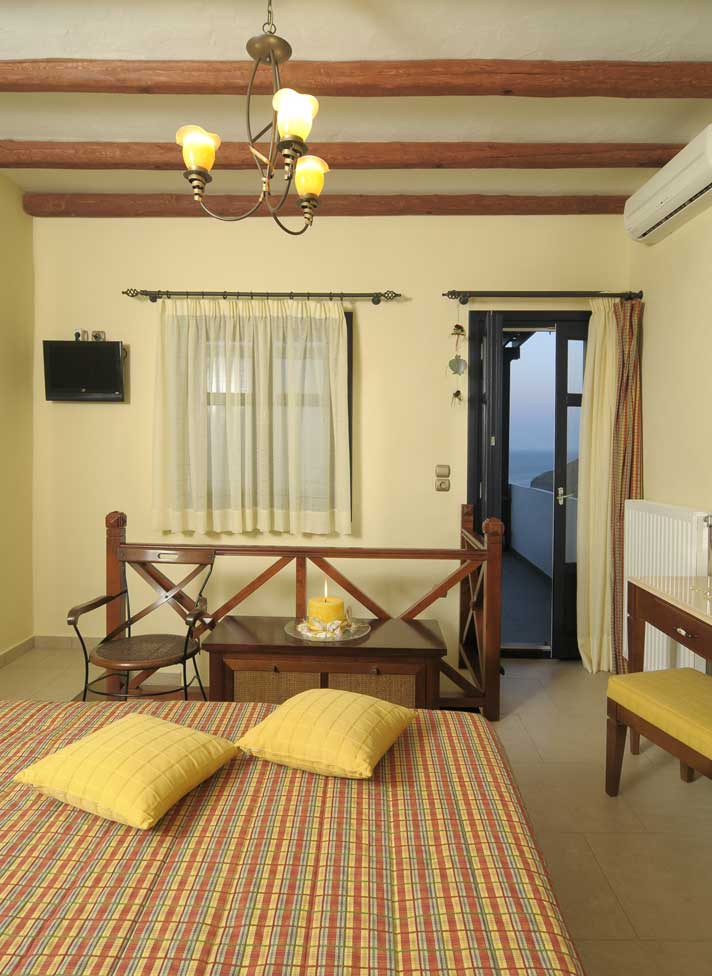 Ang Deluxe Studios ay mga eleganteng, kumpletong kagamitang studio na matatagpuan sa unang palapag ng complex. Mayroon itong double bed, desk at wardrobe na may full-length mirror, fully equipped na kitchenette na may refrigerator, dining table at stool, at isang luxurious bathroom na may shower. Nag-aalok ang mga ito ng direktang access sa bakuran na nasa hangganan ng beach ng Pera Gialos, na may natatanging tanawin ng Chora at ng Venetian castle.