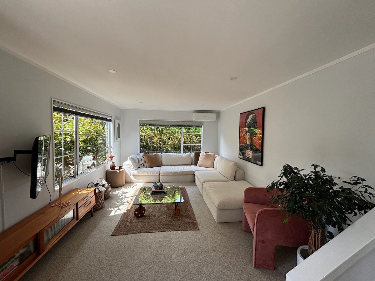 Bahagi ng aming bahay, ang pribadong pakpak na ito ay may 2 silid - tulugan, komportableng lounge at iyong sariling modernong banyo pati na rin ang isang malaking hardin na may tanawin para makapagpahinga. Mayroon kaming maliit na kusina na may microwave, refrigerator, takure atbp ngunit hindi isang buong kusina. Nasa Point Chevalier kami, isang komportableng friendly na suburb ng Auckland na may magagandang opsyon sa pampublikong transportasyon at malapit sa beach.
