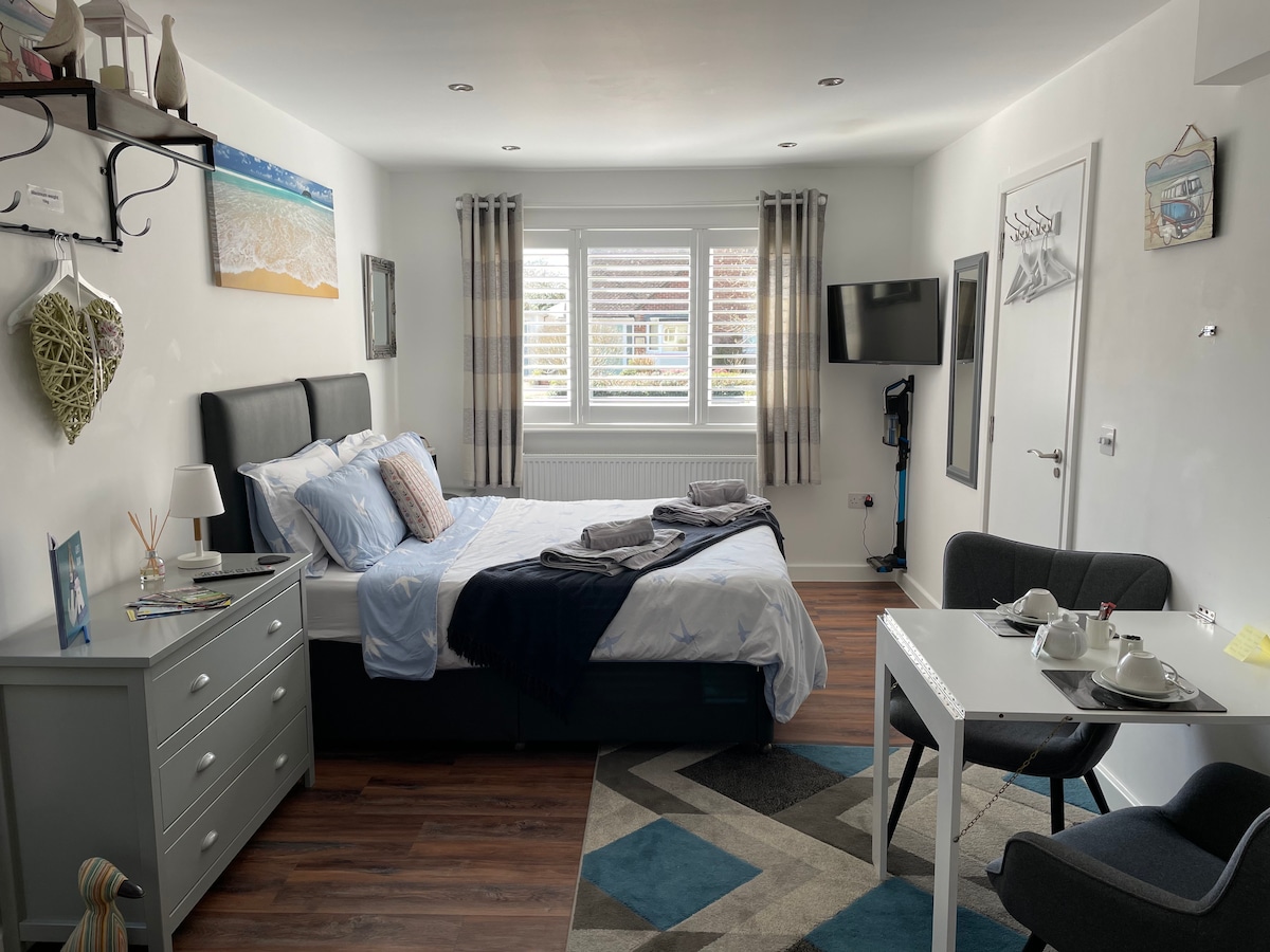 Bagong studio! Maluwag, self - contained, pribadong pasukan na darating at pupunta ayon sa gusto mo. King size bed. Ensuite shower room kasama ang kanyang mga palanggana. Dining table na may 2 upuan, refrigerator, takure, toaster at microwave. Direktang access sa maaraw na patyo at hardin. May mga breakfast goodies! 8 minutong lakad papunta sa Steamer Point at Friars Cliff beach. 10 minutong lakad papunta sa beach hut cafe. 20 minutong lakad ang layo ng Highcliffe Castle. 30 minutong lakad ang layo ng Mudeford Quay. Magpalamig ng alak, magrelaks at mag - enjoy!