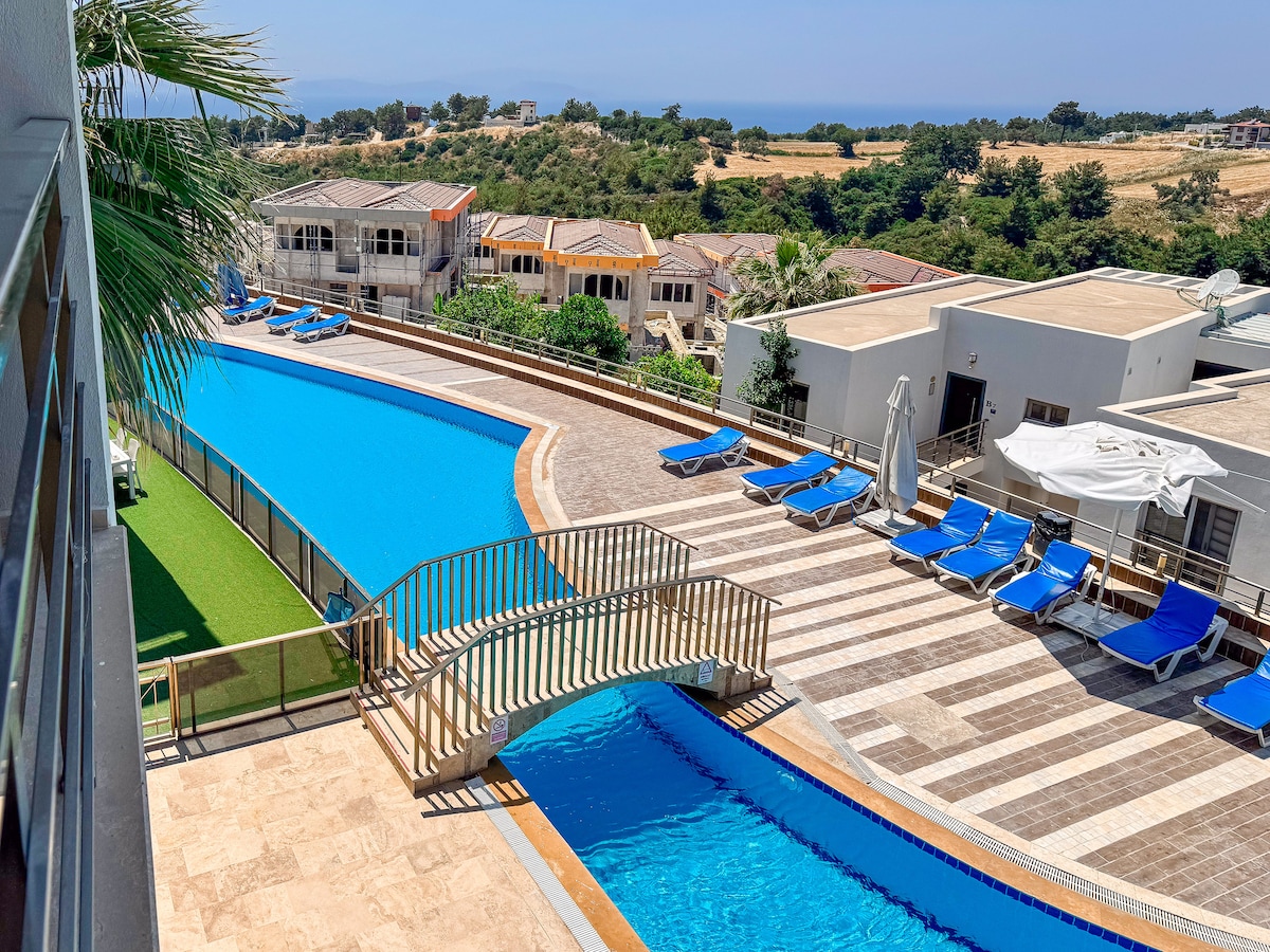 Bago! 1+1 Duplex Apartment na may Tanawin ng Pool – 400m papunta sa Beach