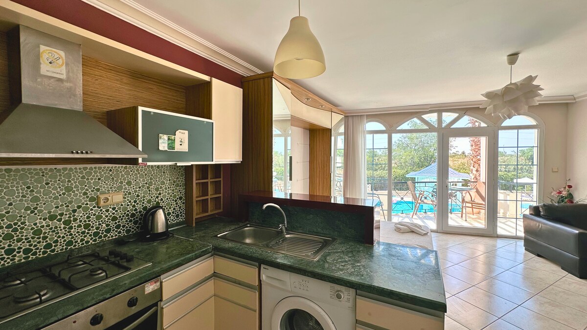 Magpahinga sa aming tahimik na 2 kuwartong tuluyan sa tabi ng pool sa Kuşadası Soğucak—perpekto para sa mga pamilya at matatanda. Makakatulog ang 6 na tao sa apartment na ito sa ground floor at mayroon itong daanang walang hagdan mula sa pribadong terrace papunta sa pool area. Mag-enjoy sa mga nakakapagpaginhawang tanawin ng kagubatan at pool na may bahagyang tanawin ng dagat, pati na rin sa mga shared pool kabilang ang pinapainit na indoor pool para sa dagdag na ginhawa sa mas malamig na buwan. 7–8 minuto lang ang biyahe papunta sa Long Beach. Bagay na bagay para sa isang nakakabighani at nakakarelaks na bakasyunan.