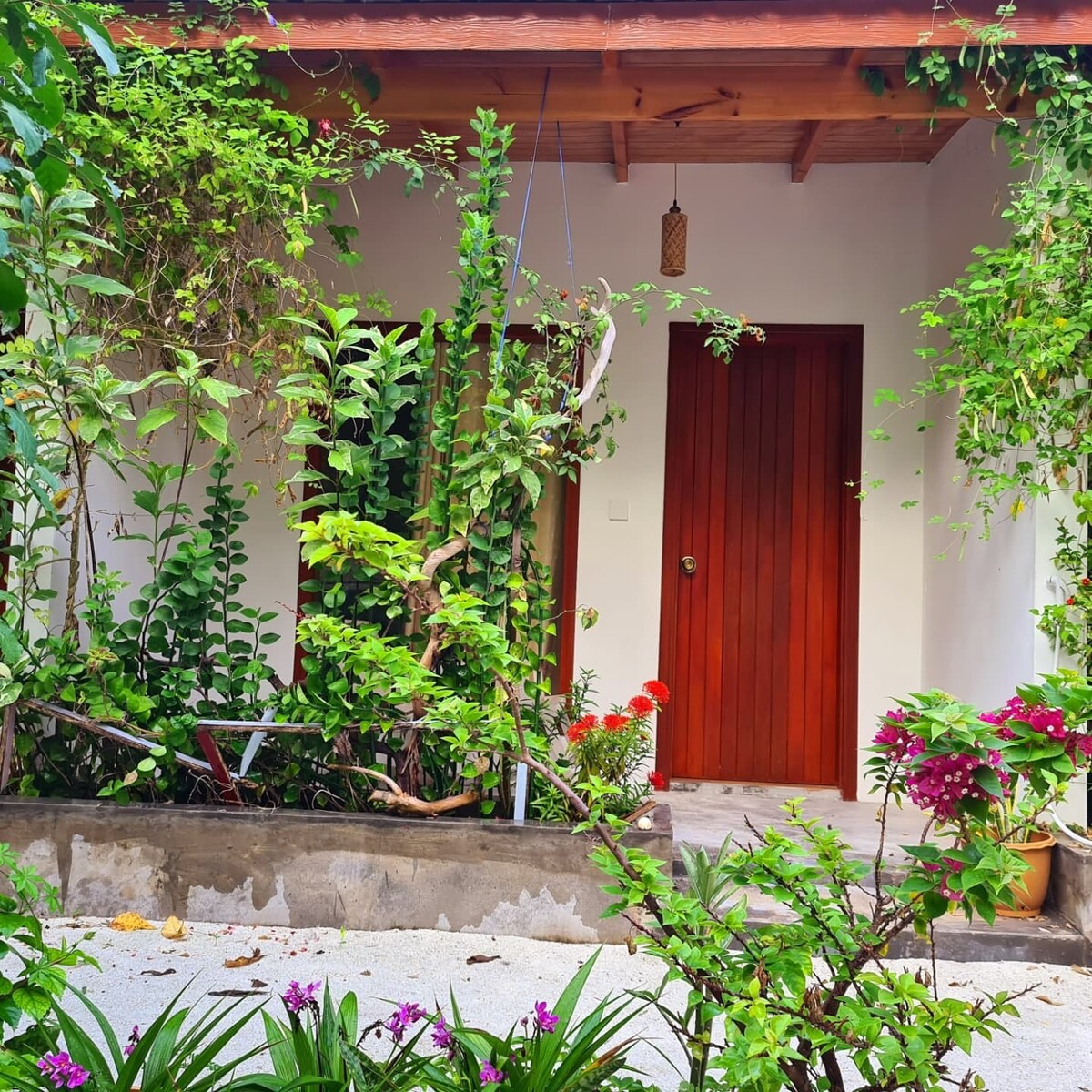 - May maingat na idinisenyong pitong deluxe na maluluwag na kuwarto, ang aming bungalow style hotel ay matatagpuan sa malinis na isla ng Dharavandhoo, sa gitna mismo ng Baa Atoll, UNESCO World Biosphere Reserve, na napapalibutan ng malinis na puting sandy beach at masiglang biodiversity. - 5 minutong lakad lang kami mula sa beach at mayroon kaming malaking terrace, outdoor dining area at libreng Wi - Fi na maraming lugar para sa trabaho. - 10 minutong biyahe lang kami sa bangka mula sa sikat na Manta/Whale shark point sa buong mundo.