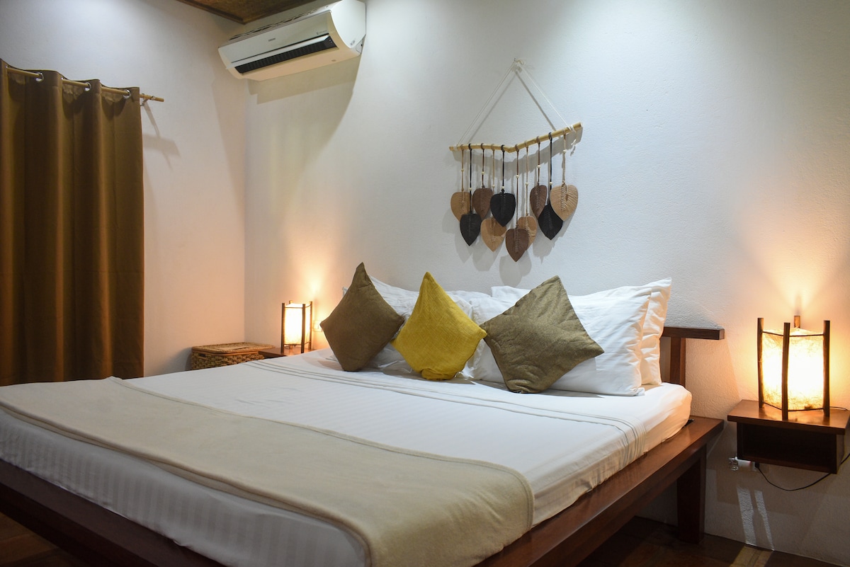 SUNRISE VILLA features 2 spacious bedrooms and 2 bathrooms, comfortably accommodating up to 6 guests. Each bedroom is furnished with one large bed and one single bed, providing a cozy and flexible sleeping arrangement for both adults and children. Please note: The base rate does not include our essential service package, which is highly recommended due to our remote, nature-surrounded location, approximately one hour by boat from El Nido. (See "Other details to note" for more information)