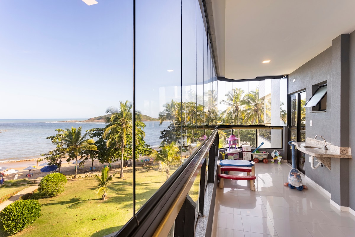 Napakahusay na binuo at nilagyan ng apartment, 100% naka - air condition, 3 suite na may exit sa balkonahe, 2 suite na may double bed, 1 suite na may 2 single bed at 1 libreng kutson para sa bawat kuwarto, (hanggang sa 9 na bisita), malaki at kusinang kumpleto sa kagamitan, games room, tv sa lahat ng kuwarto at sala, party room, gourmet kitchen, adult/children 's pool, sauna, gym, jacuzzi, 3 barbecue na may brewery. Mas malinis sa panahon ng kanyang pamamalagi, sa harap ng beach ng Peracanga, Enseada Azul, Guarapari/ES.