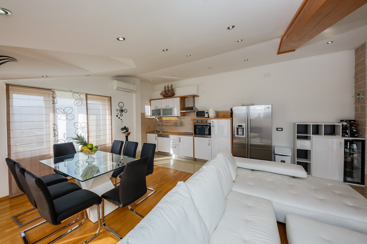 The modernly furnished apartment has a room with a separate air conditioning, TV and modern lighting. The kitchen is equipped with dishwasher, ceramic plate, microwave and all the equipment. The living room has sofas for a third person and its tv and air conditioning. The apartment has a beautiful terrace overlooking the sea, ancient Salon and Split. Guests can use our swimming pool and barbecue in the garden.
