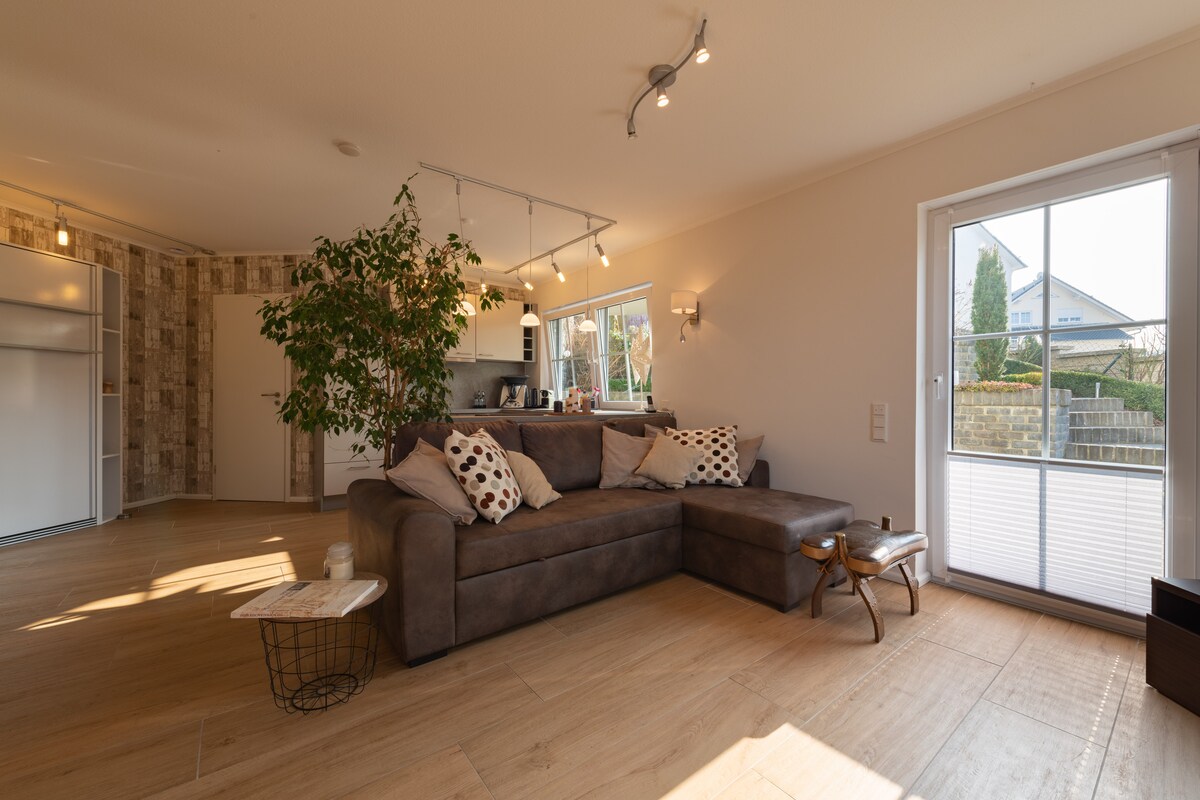 Bago, tahimik, (allergy - friendly) at 4* DTV classified apartment (approx. 50 sqm) na may south - west terrace (approx. 20 sqm) at pribadong lugar ng hardin, pati na rin ang parking space ng kotse sa isang nangungunang lokasyon ng gilid ng kagubatan na may mga kamangha - manghang tanawin sa Bad Schwalbach. Kusinang kumpleto sa kagamitan na may thermomix, microwave, nespresso machine, dishwasher at mga branded na pinggan. Daylight na banyo na may shower, hair dryer at washer - dryer. Natitiklop na higaan at pull - out na couch. May mga linen at tuwalya. 5 minutong lakad lang papunta sa pedestrian zone.