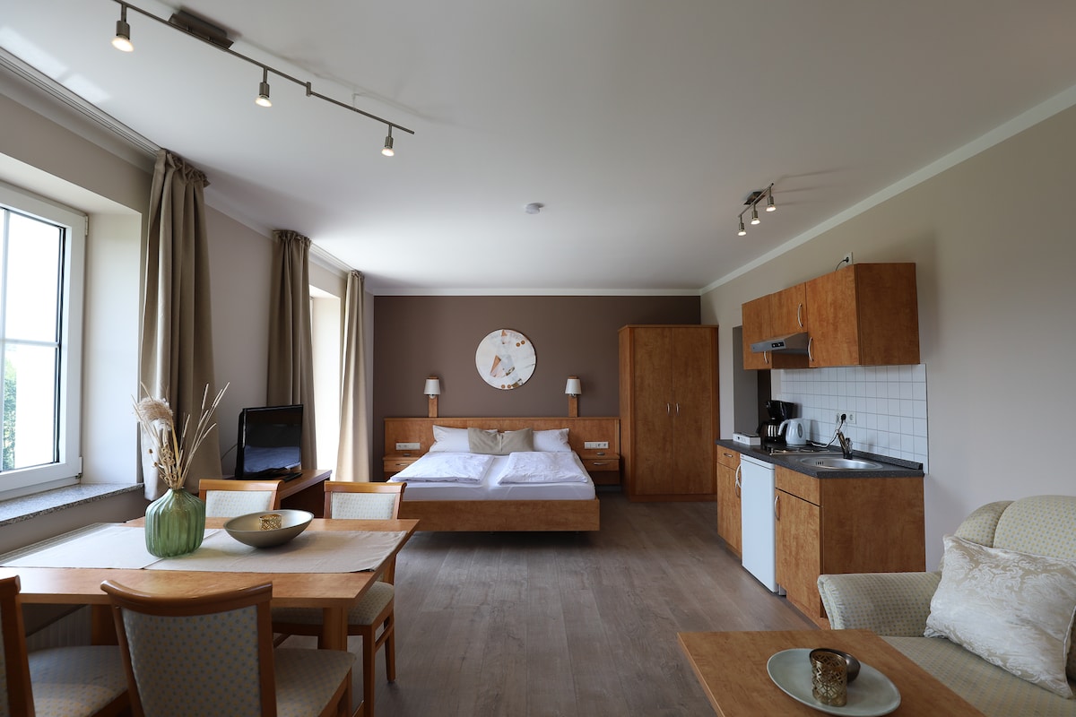 The apartment room in Bad Soden-Salmünster offers 22 sqm of space for 1 guest. It features 1 bedroom and 1 bathroom. The apartment is step-free and equipped with an elevator. Private amenities include a well-equipped kitchen, balcony, workspace, high-speed Wi-Fi for video calls, TV, and a fan. This compact apartment provides all essential comforts for a pleasant solo stay. Breakfast is available and can be booked on request.