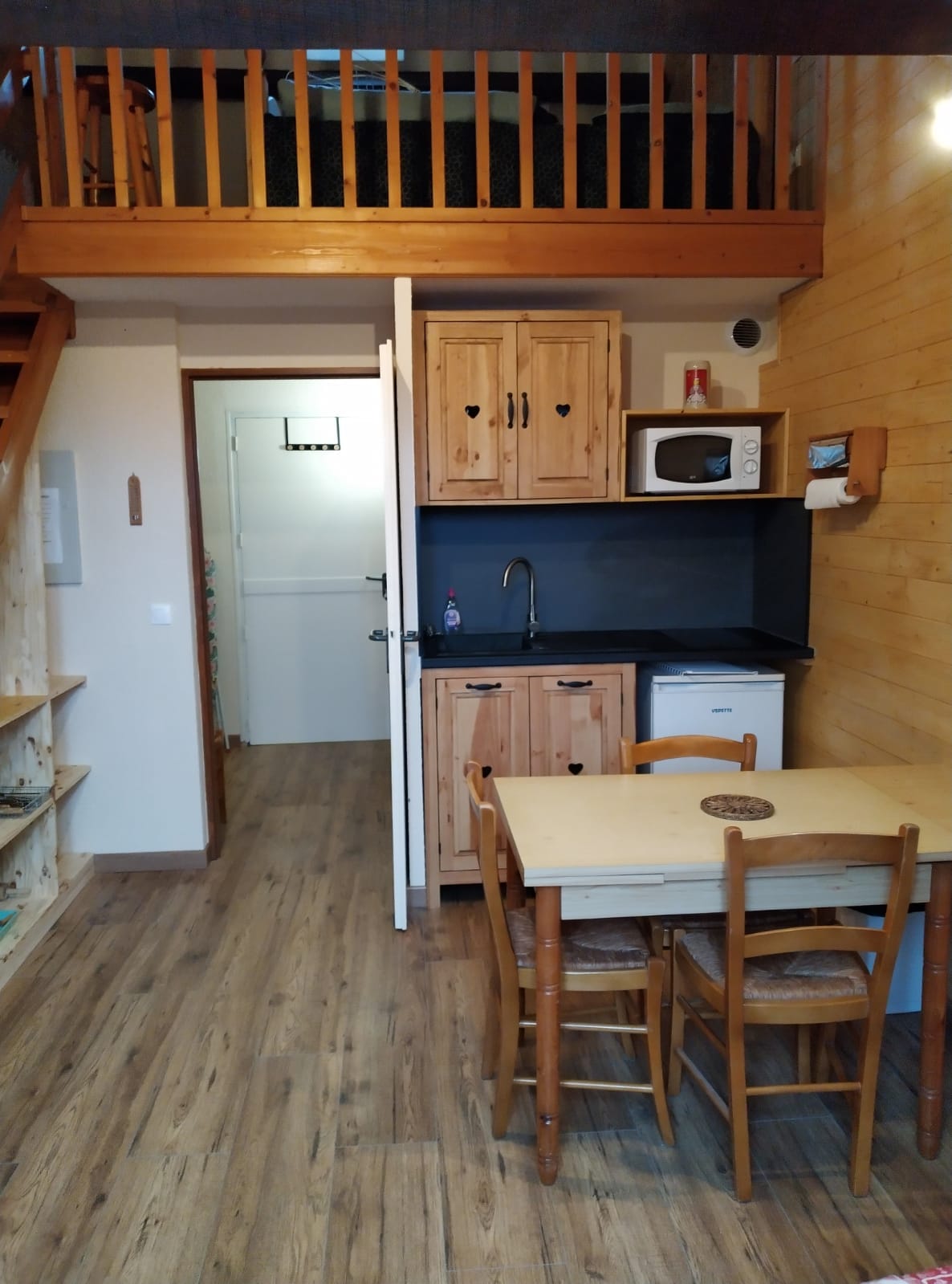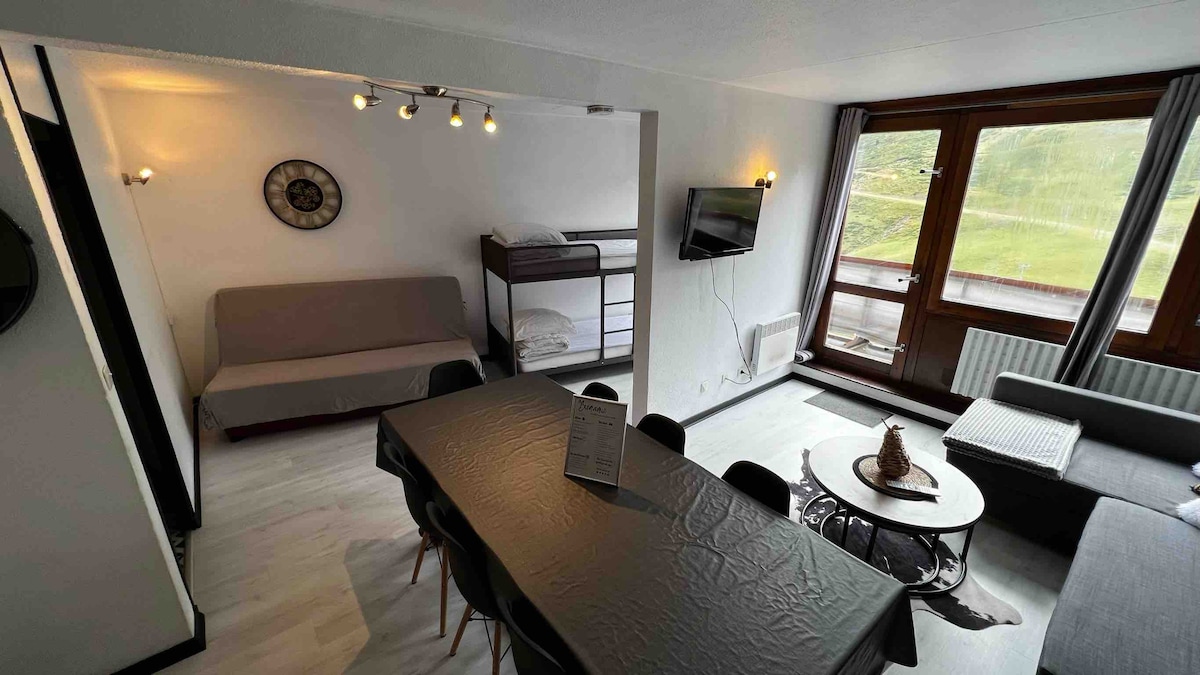apartment na 36m2 na may panloob na paradahan. sa paanan ng gusali ng mga slope na may shopping gallery sa ground floor (sa taglamig). magkakaroon ka ng pasukan, na naghahain ng banyo pati na rin ng toilet. Kasunod ng cabin room na may bunk bed at maliit na aparador. Isang magandang sala na may kusina na bukas sa sala , kung saan matatanaw ang balkonahe na 9m2 na may tanawin sa timog na nakaharap sa bundok. para tapusin din kung saan matatanaw ang balkonahe, may kuwartong may double bed at bunk.