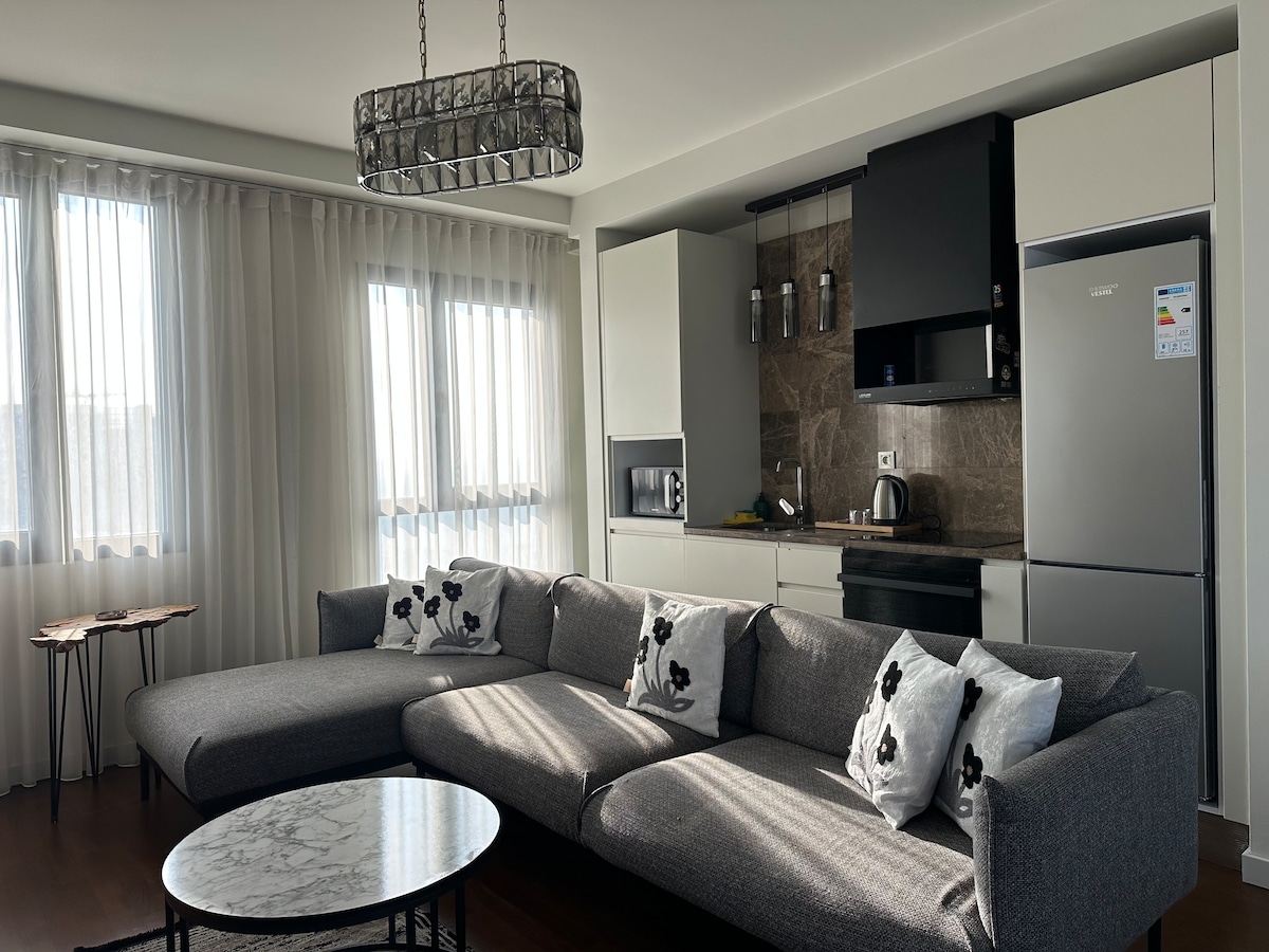 Welcome to this modern 1-bedroom apartment at, located in the vibrant Güneşli / Basin Ekspres area. 🌿This stylish apartment offers spacious living with a fully equipped kitchen, access to wellness facilities including an indoor pool, spa, sauna, and fitness center, and comes with daily free housekeeping service. We wish you a pleasant stay! ✨